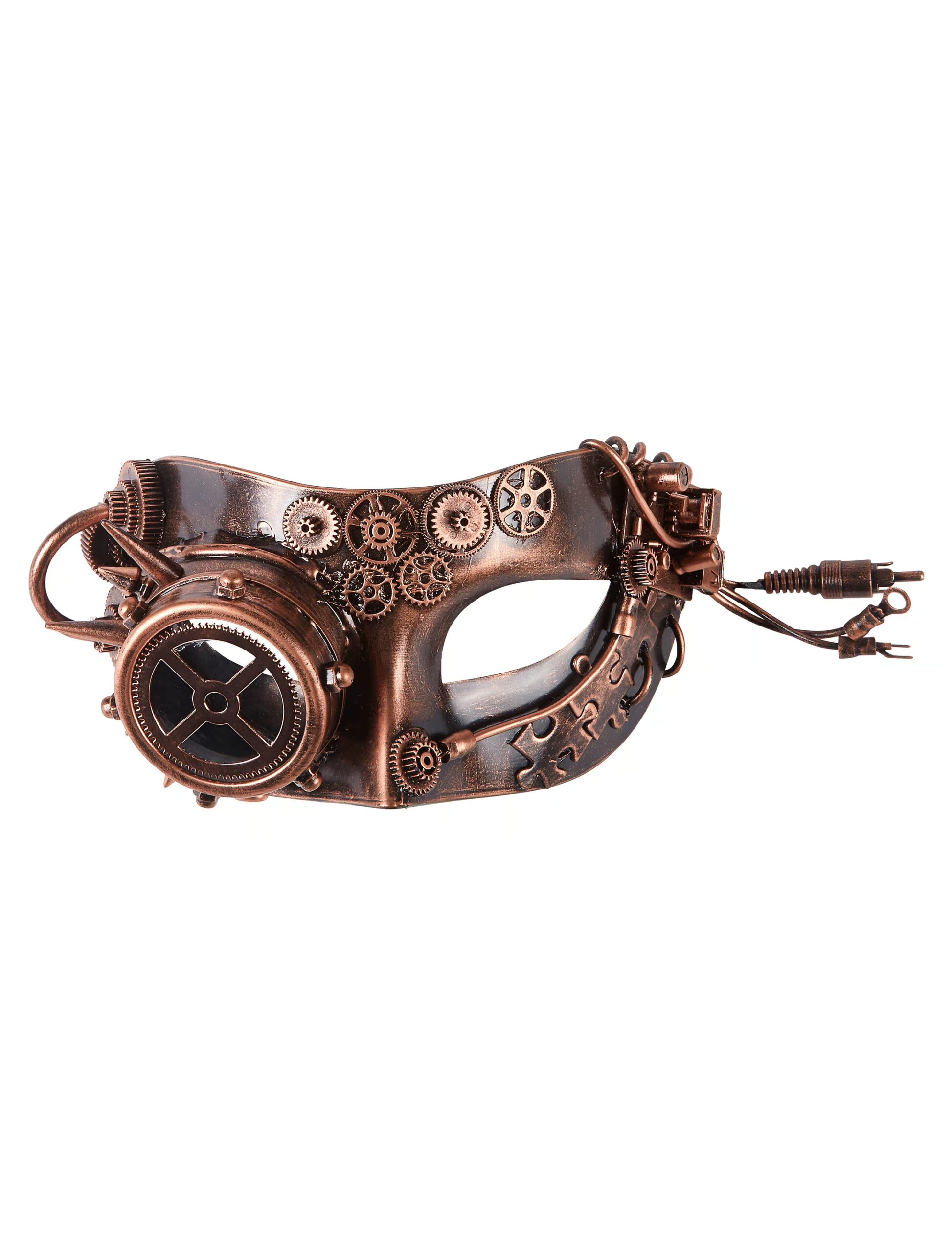 Diese epische Halbmaske ist die perfekte Ergänzung für Dein Kostüm als Steampunk oder Cyber-Gothic! Die Maske in dunklem Kupfer ist mit jeder Menge Details wie Zahnrädern, Puzzle-Teilen und Stacheln verziert. Das rechte Auge wird außerdem mit einem monokelartigen Zahnrad bedeckt. Einfach phantastisch!