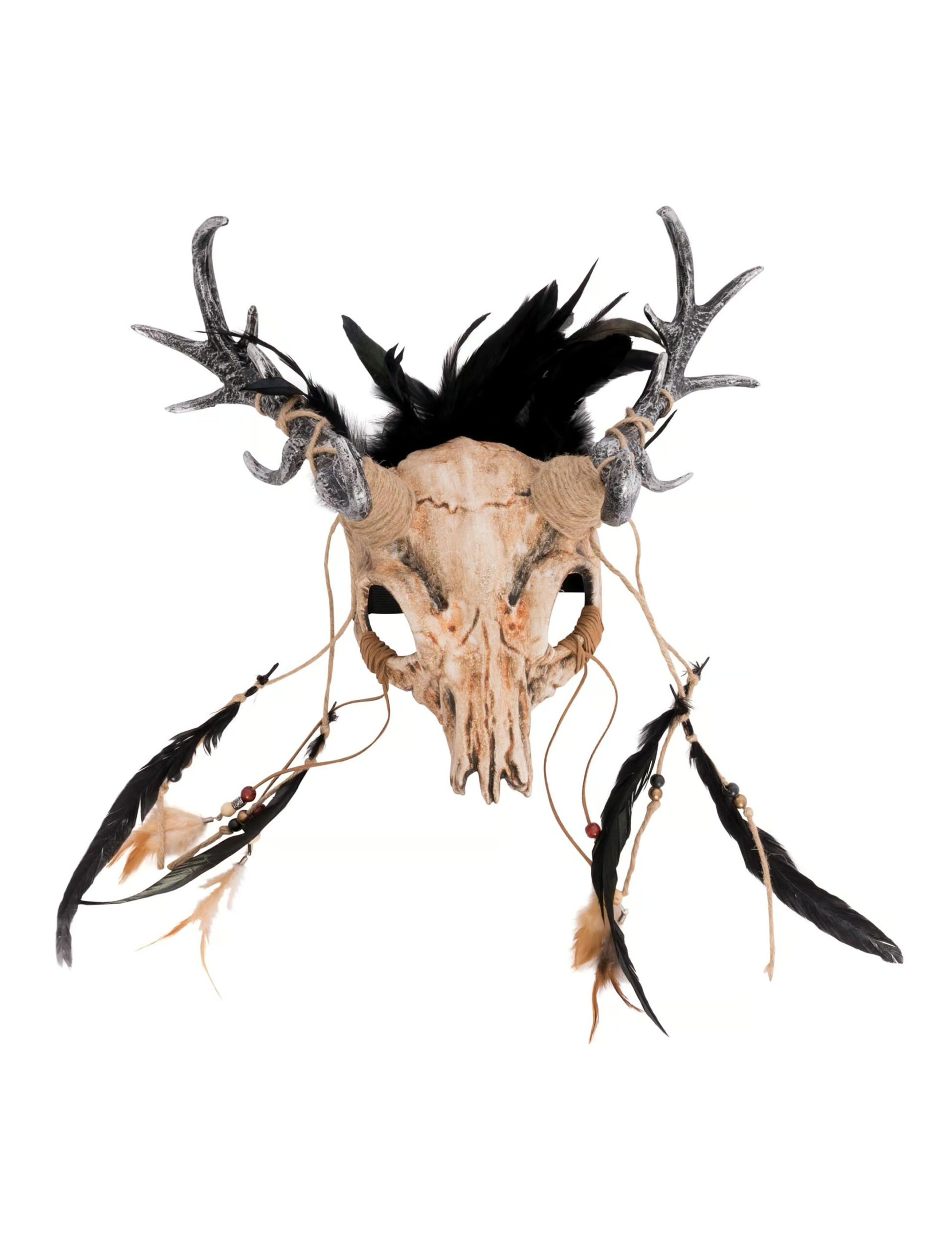 Diese Maske ist sehr originell und ausgefallen. Ein halber Ochsenschädel bildet den Hauptteil der Maske. Verziert wird die Maske mit zwei Hörnern. Schwarze Federn oben und weitere braune und schwarze Federn, sowie Perlen, die in kleinen Fäden befestigt wurden, runden die Maske zusätzlich ab. Für den optimalen Tragekomfort ist die Maske mit Gummibändern ausgestattet worden. Ideal für Kostüme als Voodoo Priester oder Indianer!