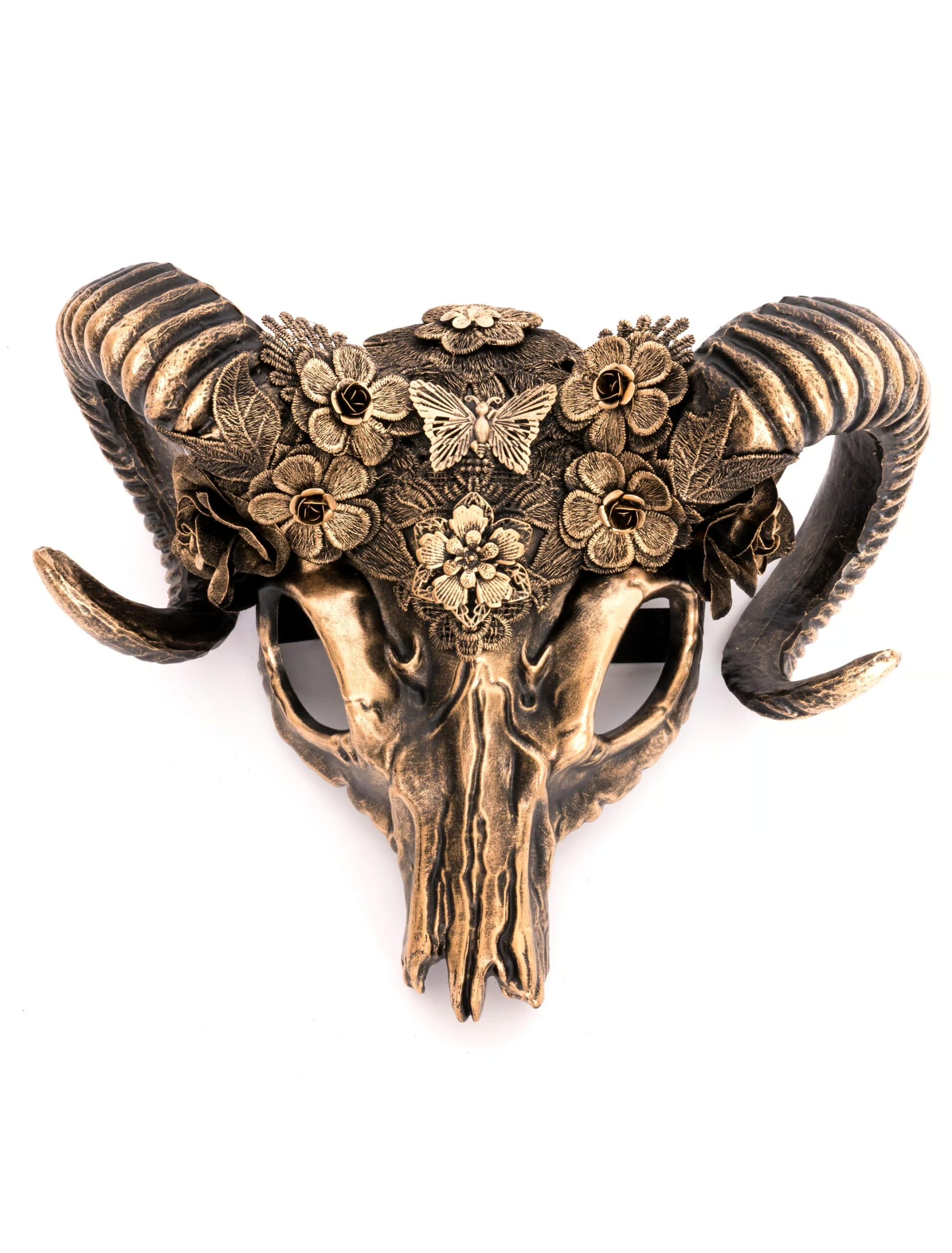 Prächtige Steampunk-Maske, die Dein Gesicht geheimnisvoll umhüllt. Sie besteht aus kupferfarbenen Kunststoff, das sehr edel aussieht. Geziert wird das Accessoire von Schmetterlingen, Blumen und zwei auffälligen Ochsen-Hörnern. Die Augenpartien sind ausgespart. Durch ein Gummiband lässt sich diese außergewöhnliche und sehr schicke Maske bequem tragen.