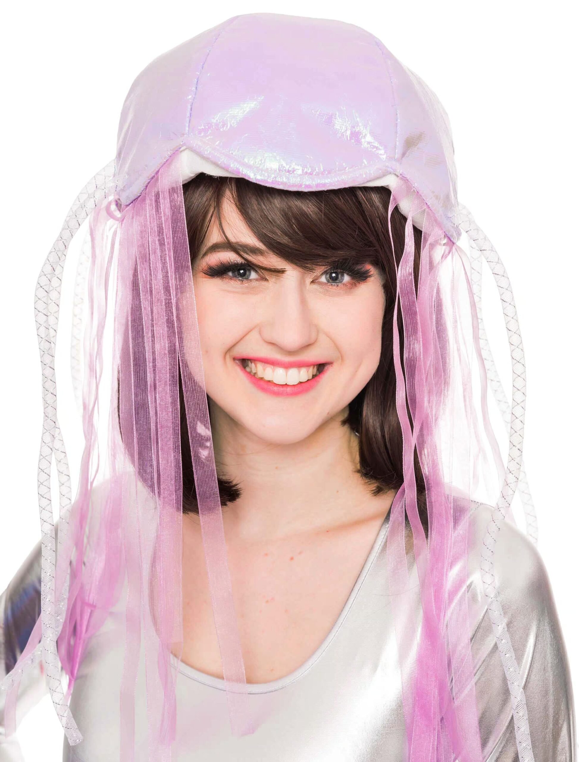 Wunderschön ist unsere silbrig glänzende, lila Quallenmütze mit dem praktischen Haltegummi, den lila Bändern und den weißen, durchscheinenden Tentakeln. Sie ist nicht nur ein attraktiver Hingucker, der alle Blicke auf sich zieht, sondern auch die perfekte Ergänzung zu den hübschen Quallen Kostümen aus unserem Shop. Als reizende Meduse bist Du ein gern gesehener Gast auf Halloween- und Karnevalpartys sowie Themen-Events mit maritimem Charakter.