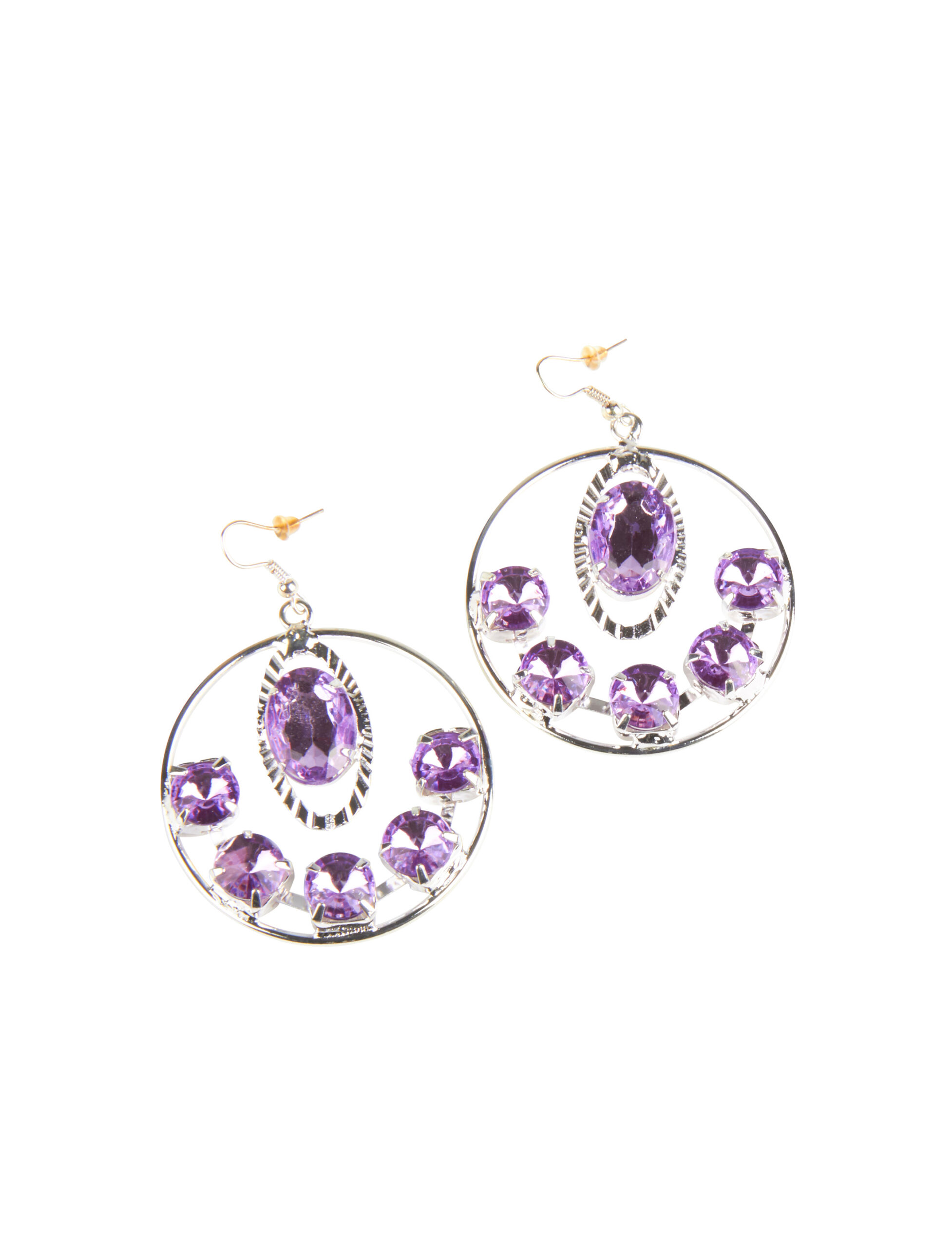 Diese schönen Ohrringe sind ein tolles Accessoire für Dein Kostüm oder Party-Outfit! Die runden Hänger sind mit 6 flieder Glitzersteinen verziert und machen ordentlich was her. Der hübsche Schmuck wir einfach in Deine vorhandenen Ohrlöcher gesteckt. Ein echter Hingucker!