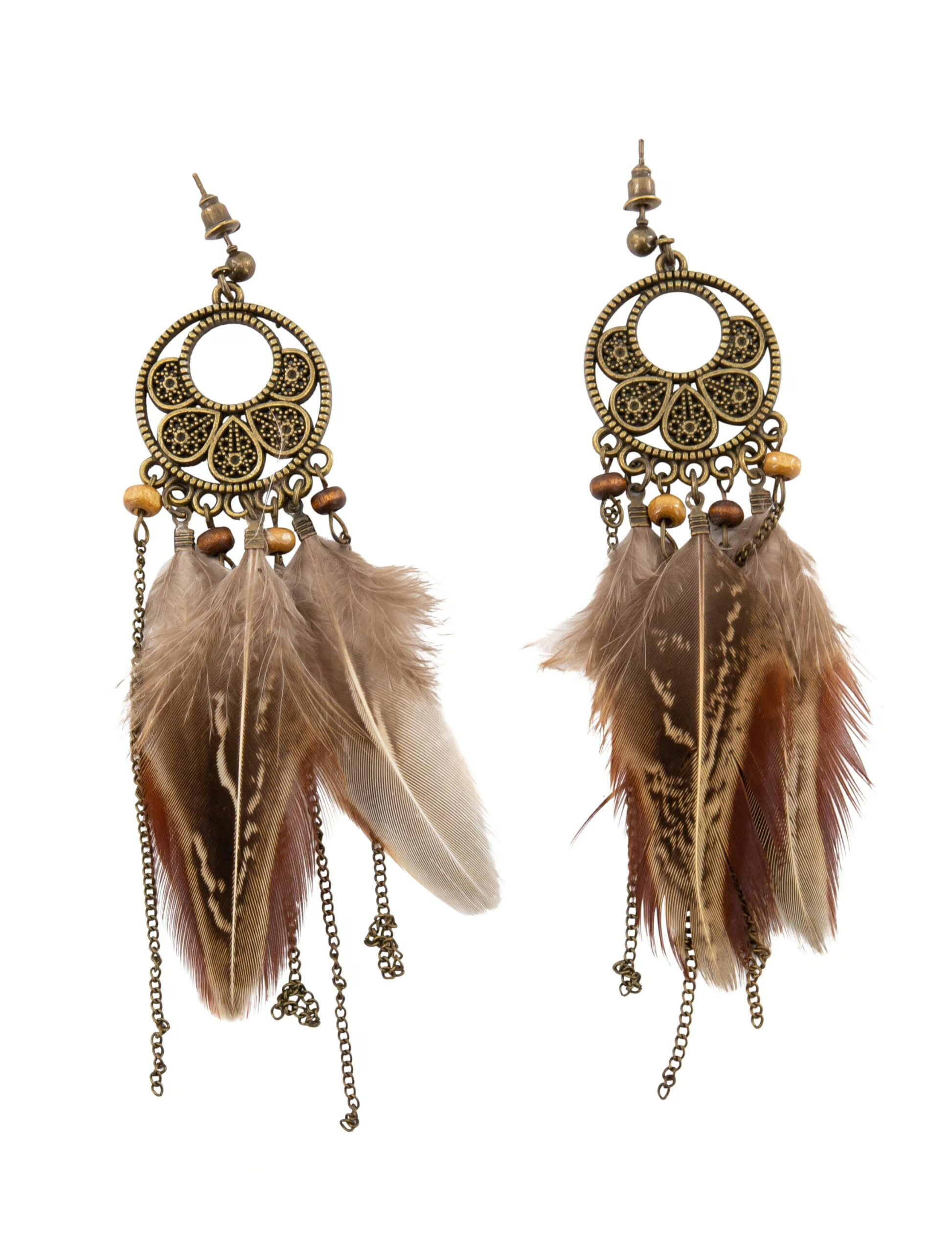 Alle Träume werden wahr? Das können wir zwar nicht versprechen, aber zumindest Dein Traum von einem stilechten Indianerin-Kostüm geht mit diesem Accessoire garantiert in Erfüllung. Die auffälligen Ohrringe bestehen aus vielen braunen Perlen, die ein tolles Muster bilden. Zusätzlich sind sie mit weißen und hellbraunen Federn sowie kleinen Ketten in Gold verziert. Ein toller Hingucker zu wilden Kostümen!