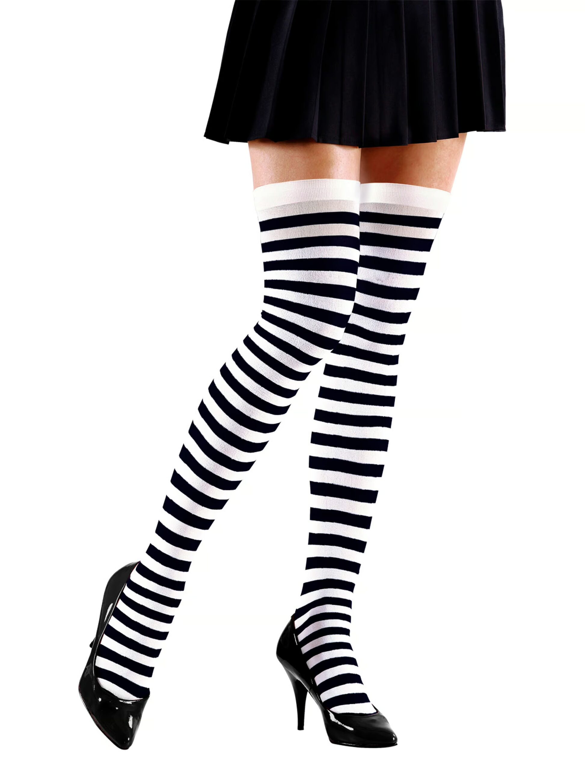 Hübsche Overknees, die Deine Beine perfekt in Szene setzen. Die beiden Kniestrümpfe (halterlosen Strümpfe) bestehen aus einem schwarz weiß-geringelten Stoff, der durch das klassische Design zu vielen Kleider, Röcken und Kostümen (Pantomime) passt. Nicht nur sexy, sondern auch bequem!