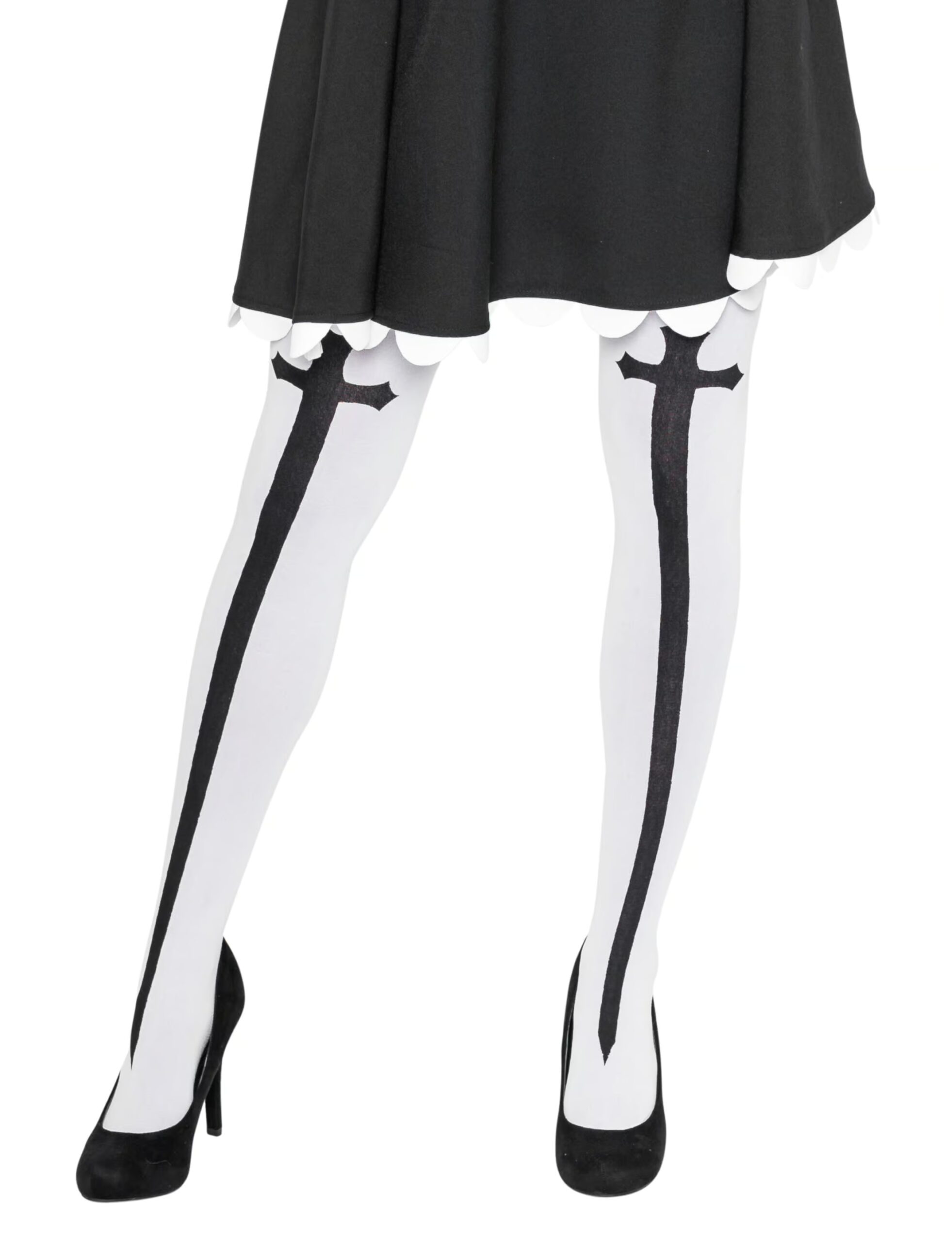 Diese weißen Overknees sind mit einem eindrucksvollen gotischen Kreuz in Weiß bedruckt. Sie machen nicht nur Draculas Braut alle Ehre, auch Rittersleute wissen die Vorzüge dieser Overknees zu schätzen. Erhältlich in One Size und mit elastischem Halteband sind die blickdichten Overknees ein unkompliziertes sowie wärmendes Accessoire, dass Deinen Halloween-Look auf gekonnte Weise abrundet und vervollständigt. In diesen Strümpfen siehst Du einfach toll aus. Sie sind ein absoluter Hingucker und Du wirst viele bewundernde Blicke ernten.