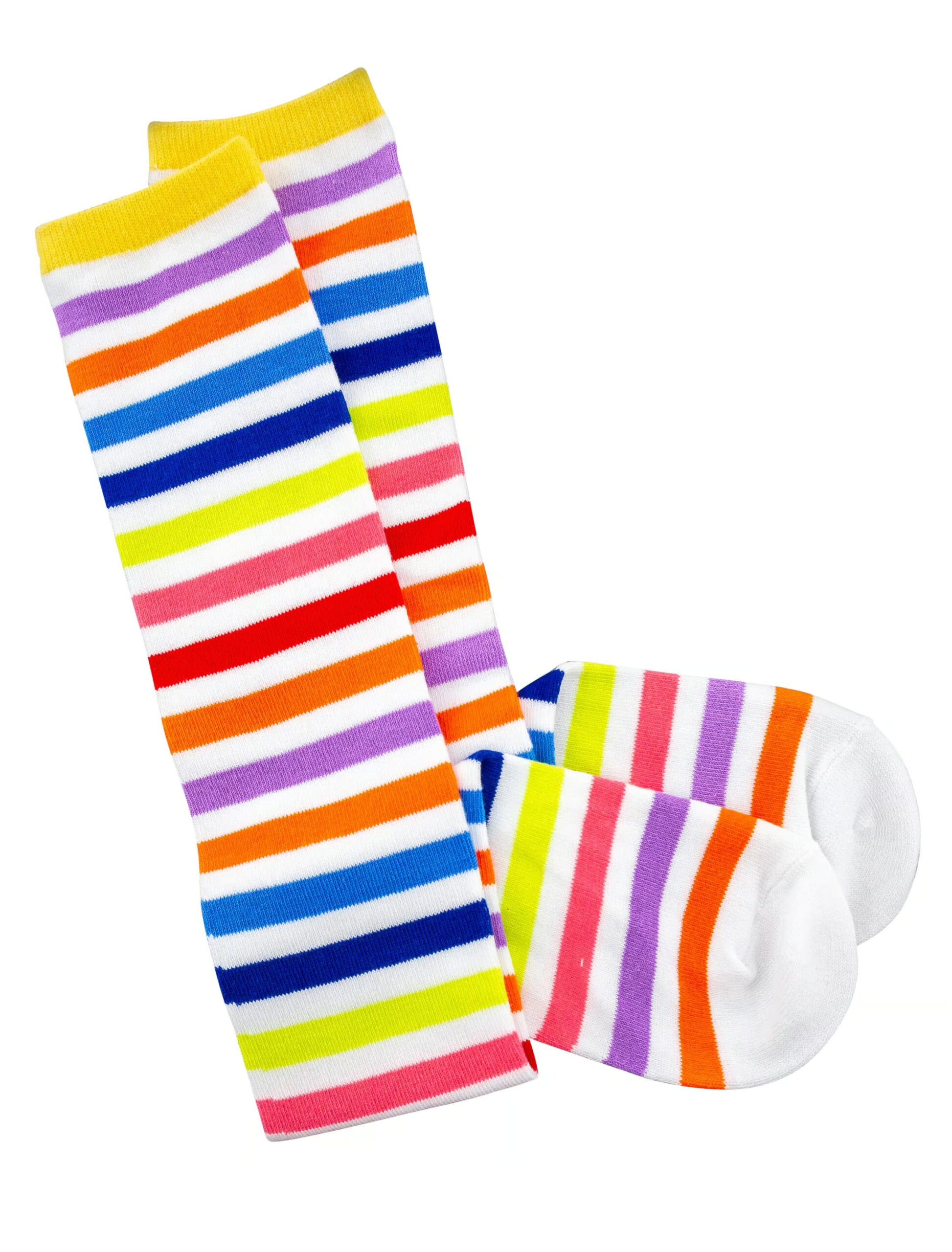 Egal ob zum ausgefallenen 80er Jahre Aerobic Kostüm oder zum crazy Clown Kostüm, mit diesen bunten Overknee-Strümpfen in Ringel-Optik liegst Du goldrichtig. Die schönen Overknees mit den bunten schmalen Streifen aus Baumwolle, Polyester und Elasthan sind nicht nur aparte Hingucker, sondern auch angenehm zu tragen und wärmend. Kombiniere sie mit pfiffigen Kostümteilen und originellen Accessoires aus unserem Shop und genieße die närrische Zeit auf Kostümpartys, Karnevalsveranstaltungen und Mottopartys.