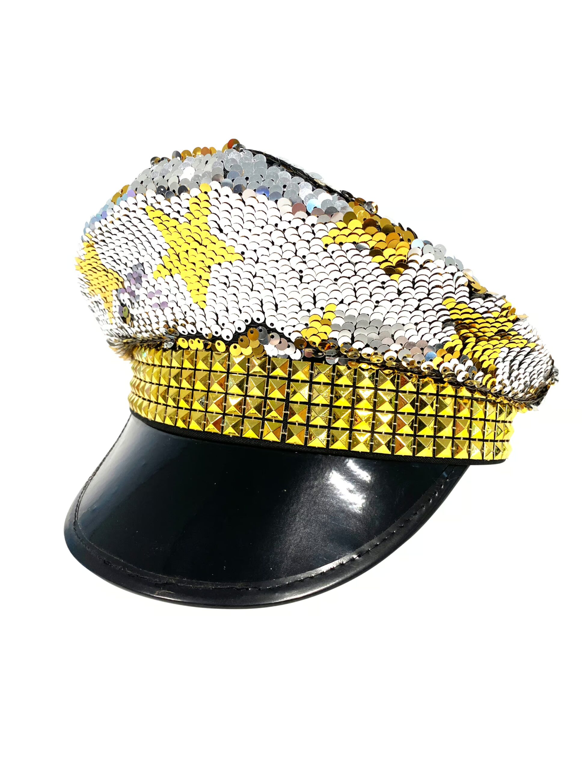Dieser glamouröse, glitzernde und prachtvolle Paillettenhut in Silber mit goldenen Sternen und Nietenbesatz sowie dem schwarzen, glänzendem Schild ist ein außergewöhnliches schickes Accessoire, mit dem Du die unterschiedlichsten glamourösen Kostüme und Partyoutfits effektvoll aufpeppen kannst. Mit den passenden Teilen aus unserem Shop bist Du der charmante Traumschiffkapitän, Baron Münchhausen oder auch ein tollkühner Ballonfahrer, der zum Fasching und Karneval die Faschingsschönen in eine fantastische Welt entführt.