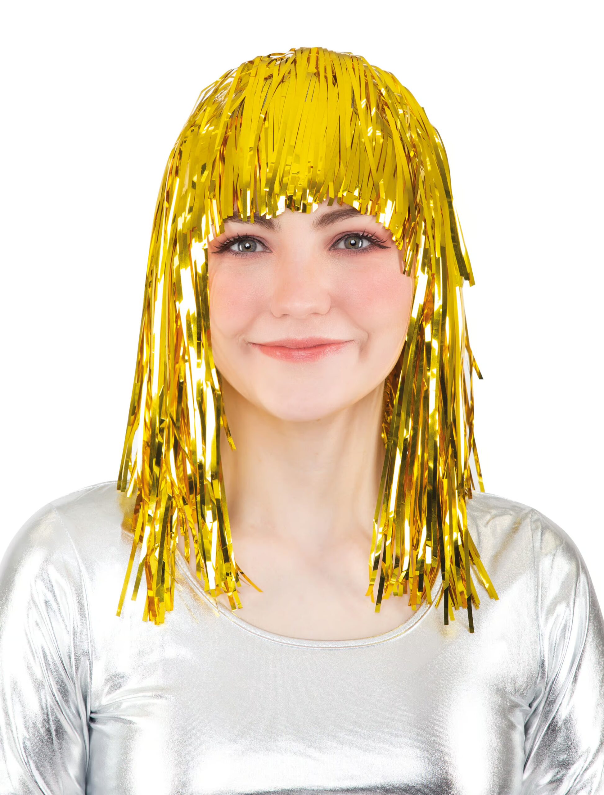 Mit unserer Lametta Perücke in Metallic Optik wirst du garantiert zum funkelnden Highlight jeder Party. Die glänzenden Strähnen fallen wie ein Wasserfall aus purem Glamour über deine Schultern und reflektieren das Licht besser als jede Discokugel. Ob Karneval, Silvester oder einfach nur, weil du der Star des Abends sein willst – diese Perücke bringt die richtige Portion Bling-Bling mit!