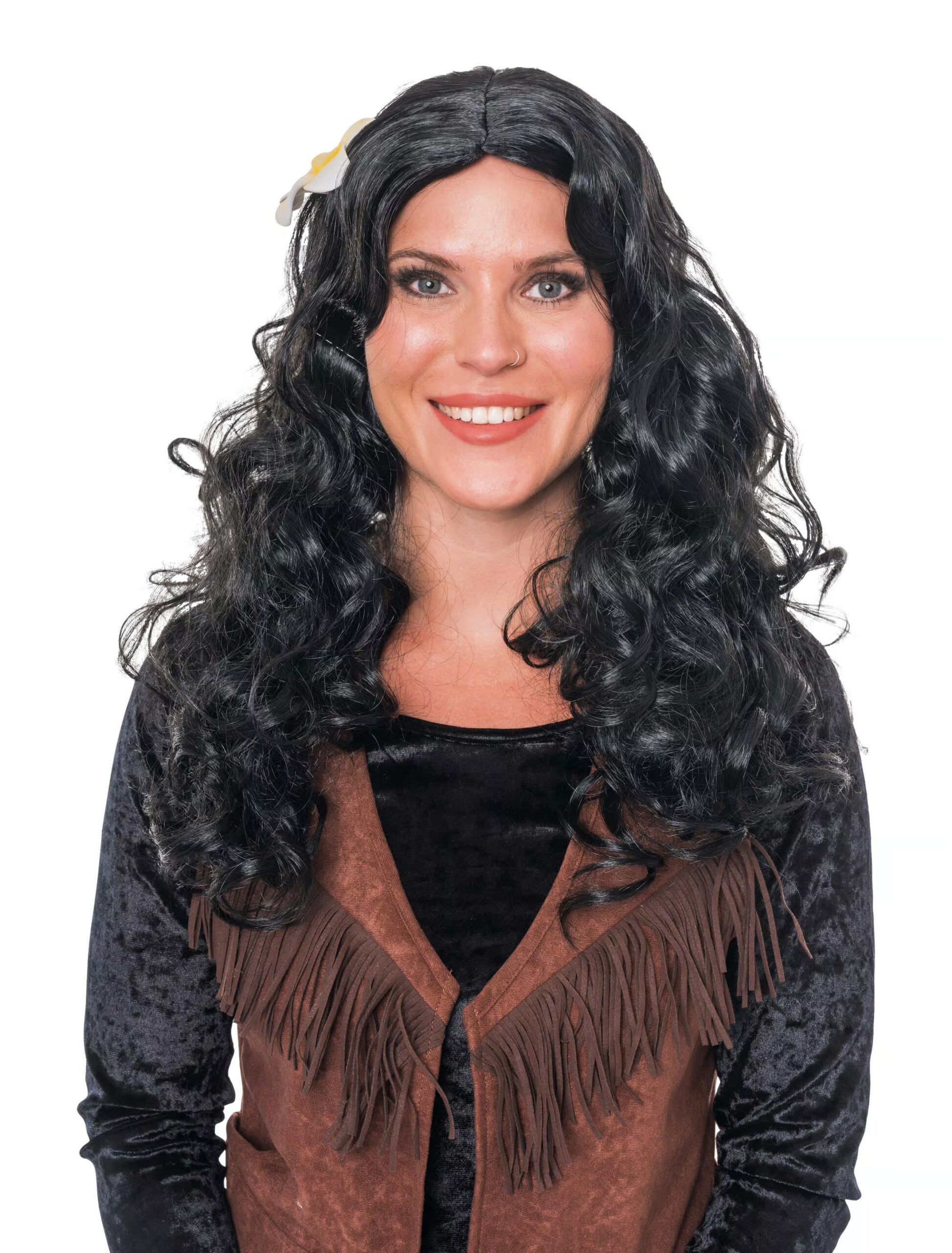 Kostümzubehör Perücke Langhaar lockig mit Blüte schwarz