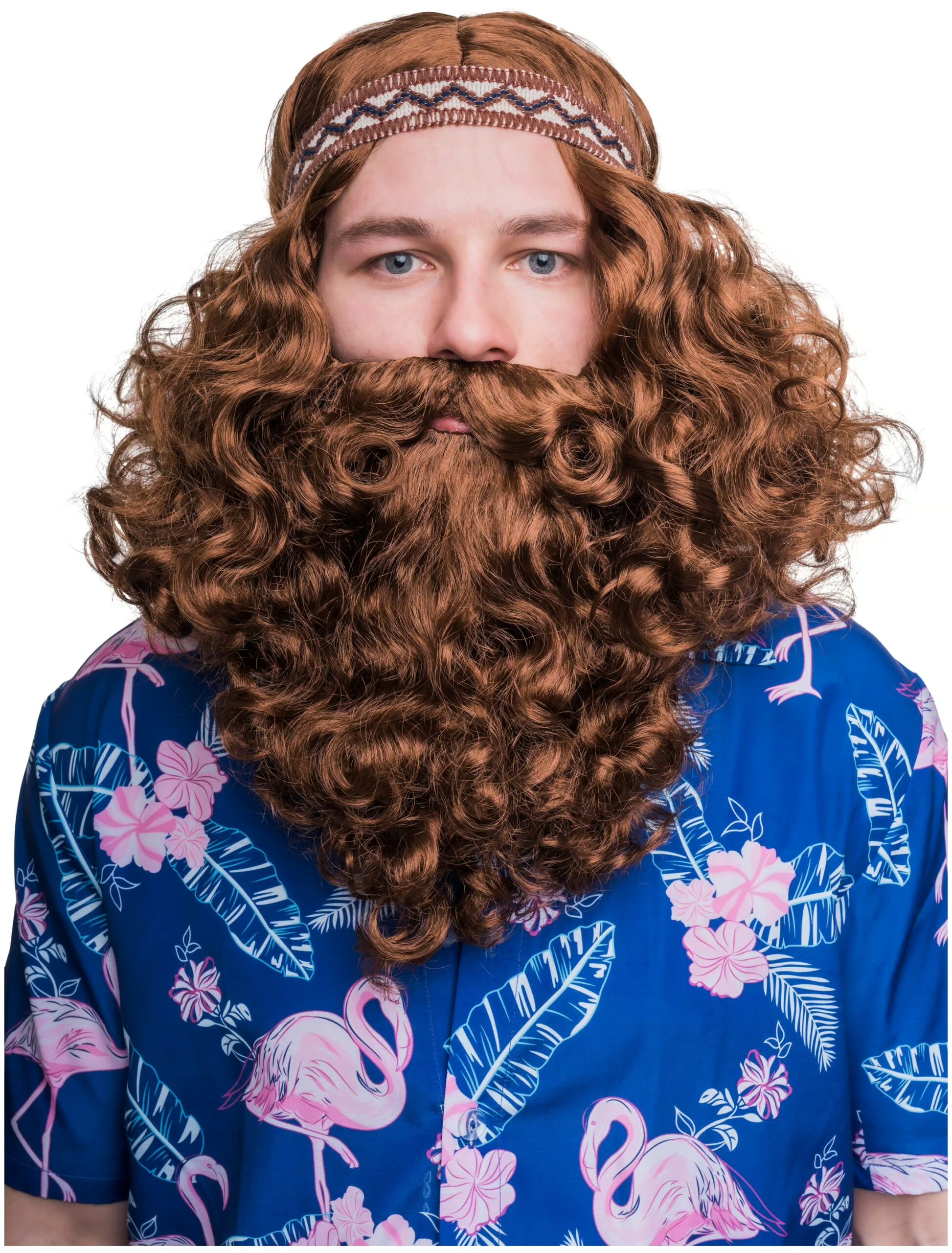 Kostümzubehör Perücke Langhaar mit Vollbart und Haarband braun