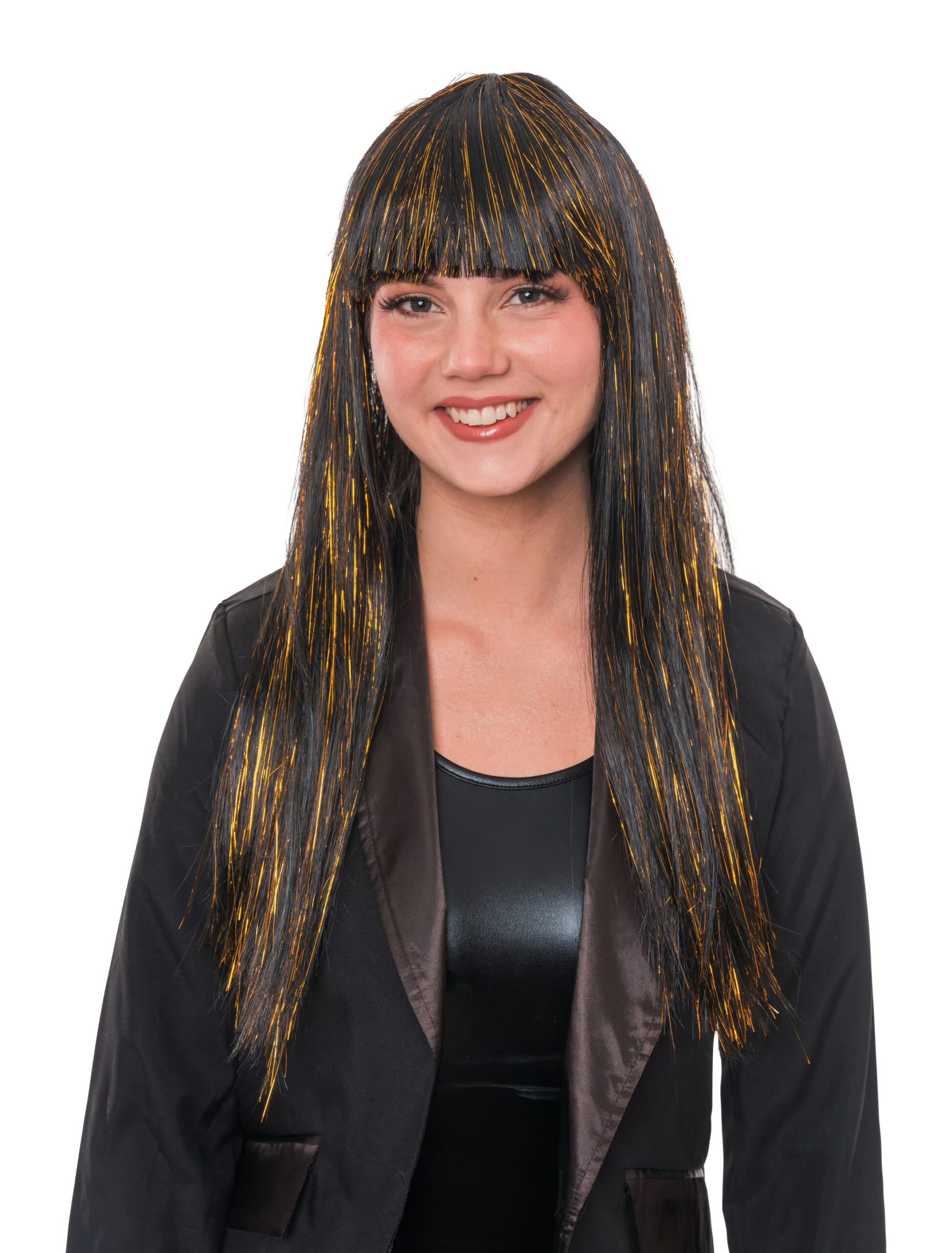 Von der ersten Sekunde an ein Blickfang – unsere Perücke mit langen Lamettafäden und geradem Pony sorgt für maximale Aufmerksamkeit. Die glänzenden Strähnen fallen bis über die Schultern und bewegen sich funkelnd bei jedem Schritt. Perfekt für Karneval, Shows oder jede Feier, bei der der Look strahlen soll.