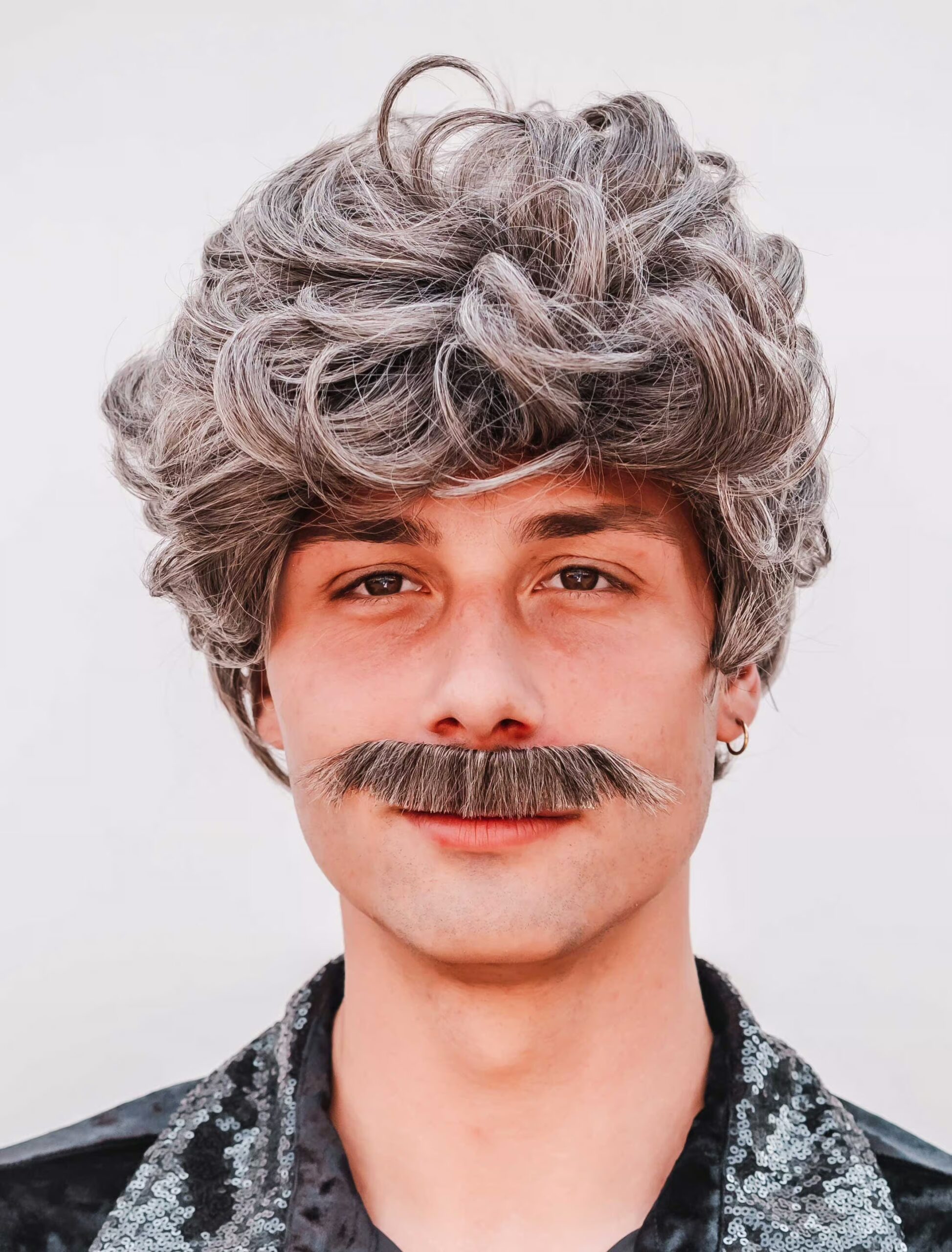 Perücke Reporter mit Schnurrbart Herren grau, ideal für Karneval & Fasching