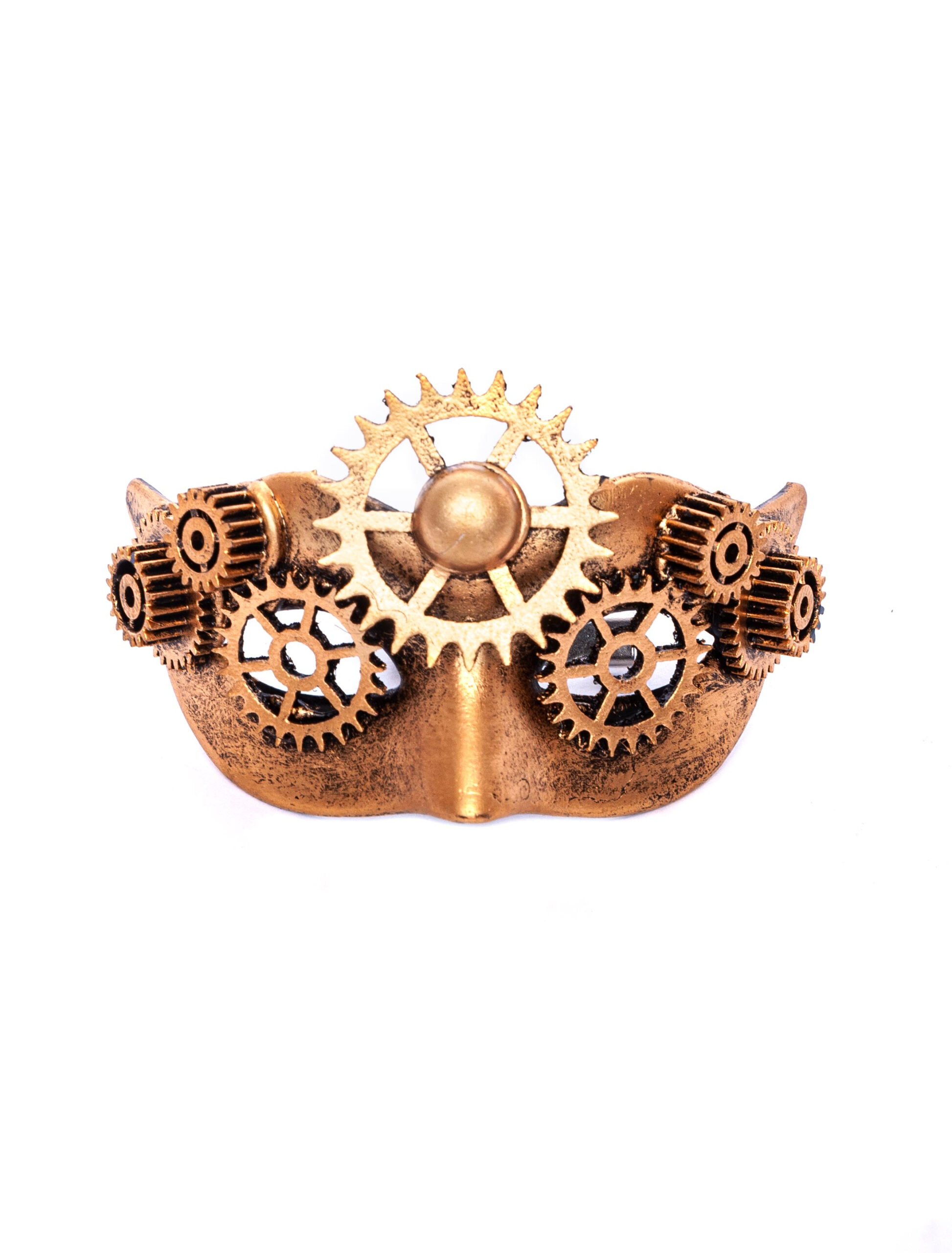 Als Steampunk-Anhänger oder auf der Suche nach einem Accessoire für Halloween ist dieser Pin genau das Richtige. Bei dem Anstecker handelt es sich um eine goldene Minihalbmaske, welche durch sieben Zahnräder ein skurriles Antlitz erhält. Der Pin ist 7 x 4,5 cm groß und besteht zu 95 Prozent aus Plastik und zu 5 Prozent aus Polyester. Die integrierte Anstecknadel sorgt für einen angenehmen und gleichzeitig sicheren Sitz an jedem Kostüm.