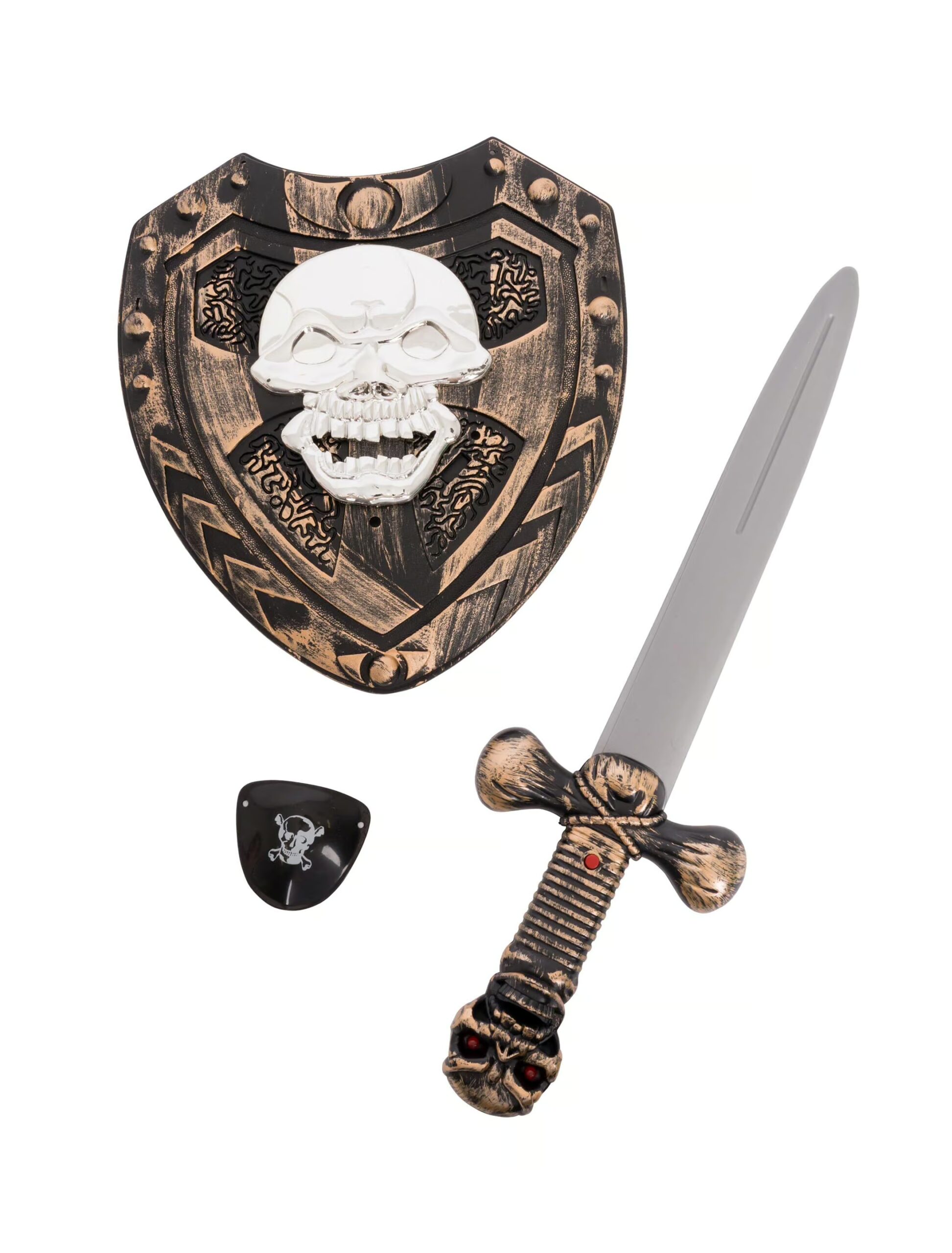 Für viele kleine Jungen ist es das Größte, einmal ein Pirat zu sein, Abenteuer zu bestehen und über die Weltmeere zu segeln. Mit diesem dreiteiligen Piratenset machst Du Deinem Kind eine Riesenfreude. Denn in seinem Piratenkostüm und mit dem Set wird es sich zum Karneval wie ein echter Pirat fühlen. Das schwarz-goldene Set mit Totenkopfdesign besteht aus einem Piratenschwert mit Licht und Sound, einer Augenklappe mit Schnur zum fixieren und einem passenden Schild mit Halterung.
