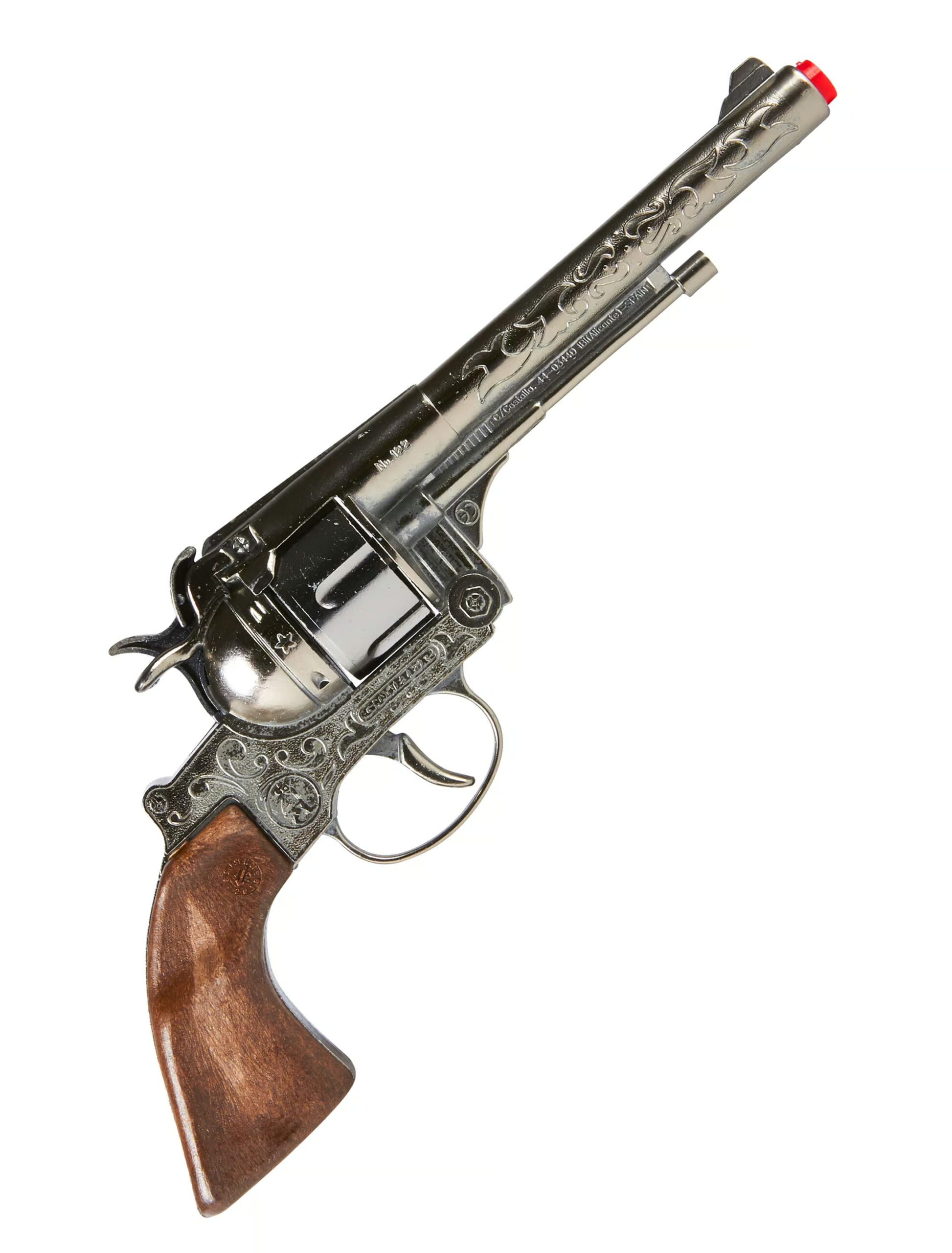 Ein echtes Schmuckstück ist dieser Revolver. Mit edlen Gravuren am Lauf sieht jeder auf den ersten Blick, dass diese Schusswaffe etwas Besonderes ist. Mit einer Länge von ca. 27 cm und der 12-Schuss Munitionstrommel ist sie auch noch der perfekte Begleiter für Deine Karnevals-Abenteuer. Fehlt Dir noch das Cowboy-Kostüm dazu? Dann schau Dich gerne bei uns um.