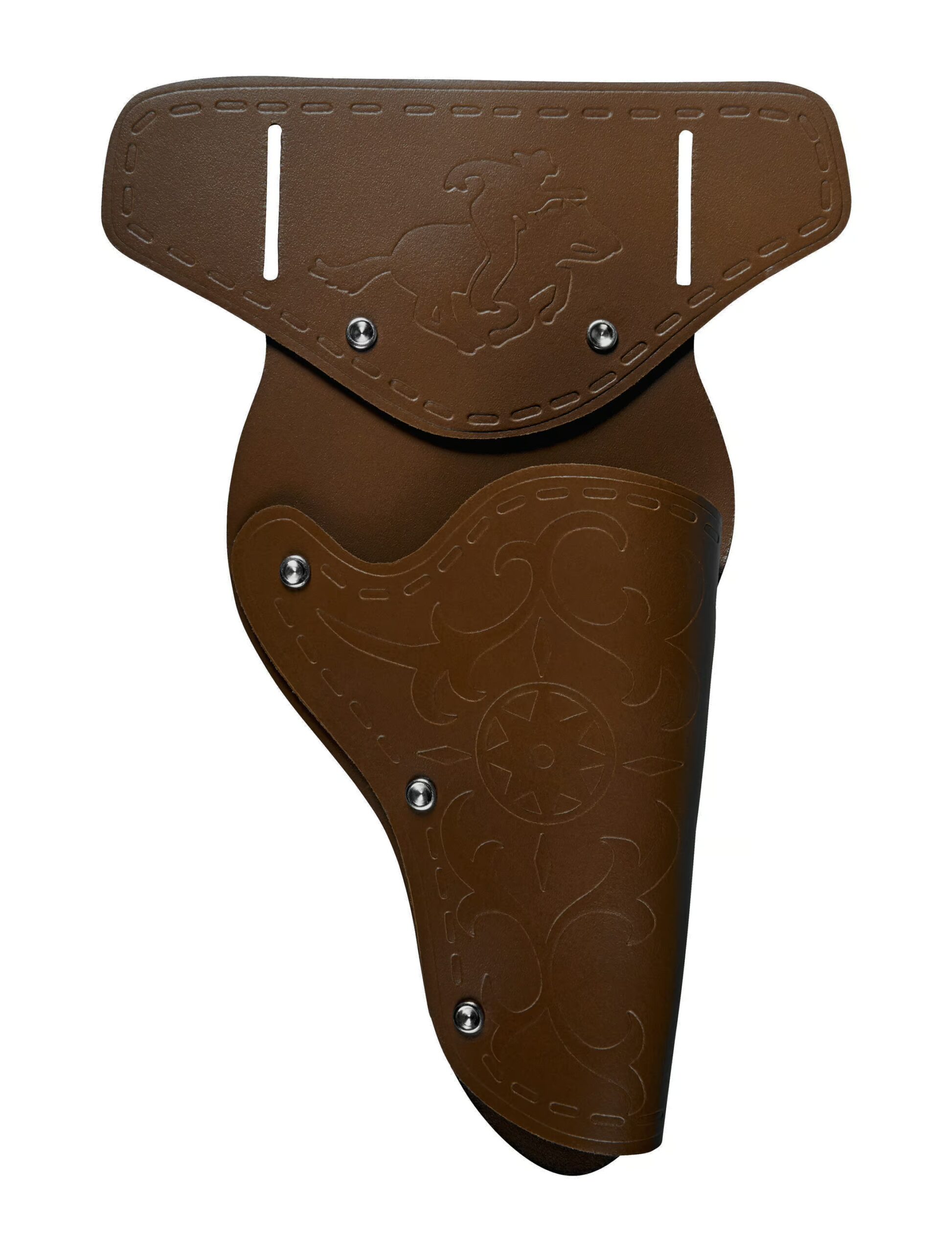 Die meisten Colthalter sind schwarz und passen somit zu jedem Cowboy-Look. Dieser Holster überzeugt durch ihren dunkelbraunen Look. Mit den Schnörkeln und dem Cowboy vorne drauf sieht sie auch einfach klasse aus. Perfekt zu Deinem Cowboy Kostüm.