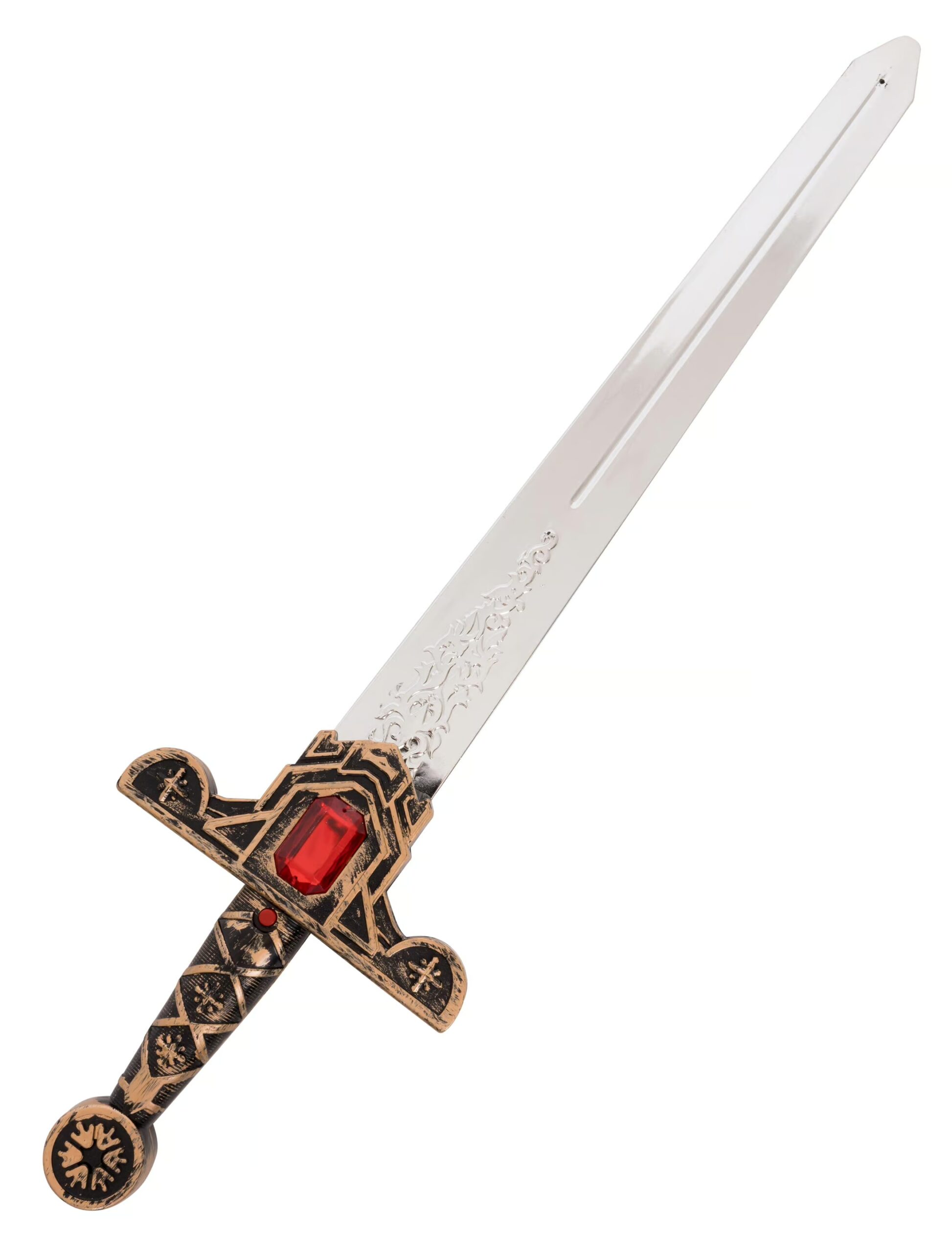 Mit diesem schönen Ritter-Schwert aus Kunststoff, inklusive Knopfzellen-Batterien, wird aus Deinem Kind in seinem Ritterkostüm, erst ein richtiger Ritter. Das attraktive Schwert mit dem goldenen, schön gearbeiteten Griff, der edel verzierten Klinge und dem großen, auffälligen, roten Stein ist ein Hingucker, um den Dein Kind sicher beneidet wird. Das Besondere dieses Schwertes sind die Soundeffekte, die Dein Kind per Knopfdruck ertönen lassen kann.