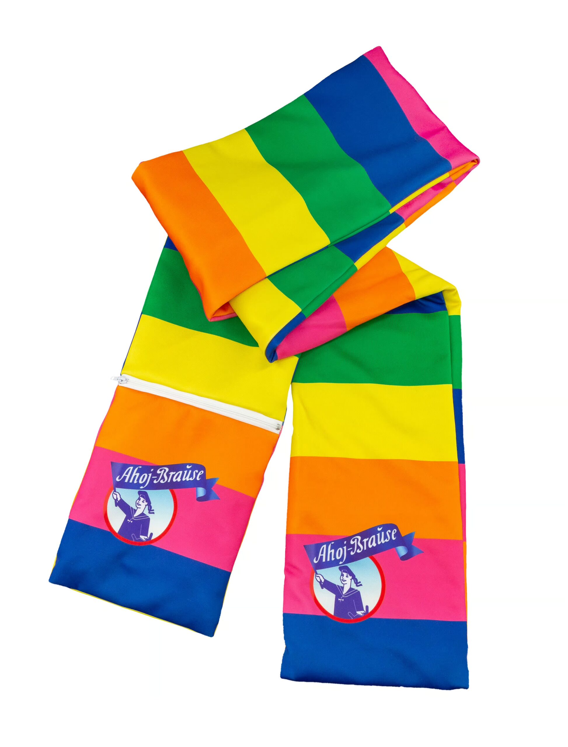 Wir haben ihn: den Original Ahoj-Brause Schal! Ein Blickfang für alle Junggebliebenen und Retro-Fans! Dieser bunt gestreifte Schal wärmt den Hals in der kalten fünften Jahreszeit. Mit einem Reißverschlussfach ausgestattet bietet er sogar Platz für alle persönlichen Dinge, wie Smartphone, Schminke oder Schlüssel. Der Regenbogen Ahoj-Brause Schal ist an beiden Enden mit dem charakteristischen Matrosen-Logo bedruckt. Der Schal darf zu Deinem Ahoj-Brause Kostüm nicht fehlen und garantiert eine prickelnde (Retro)-Party! Exklusiv bei uns. Offizielles Merchandise!