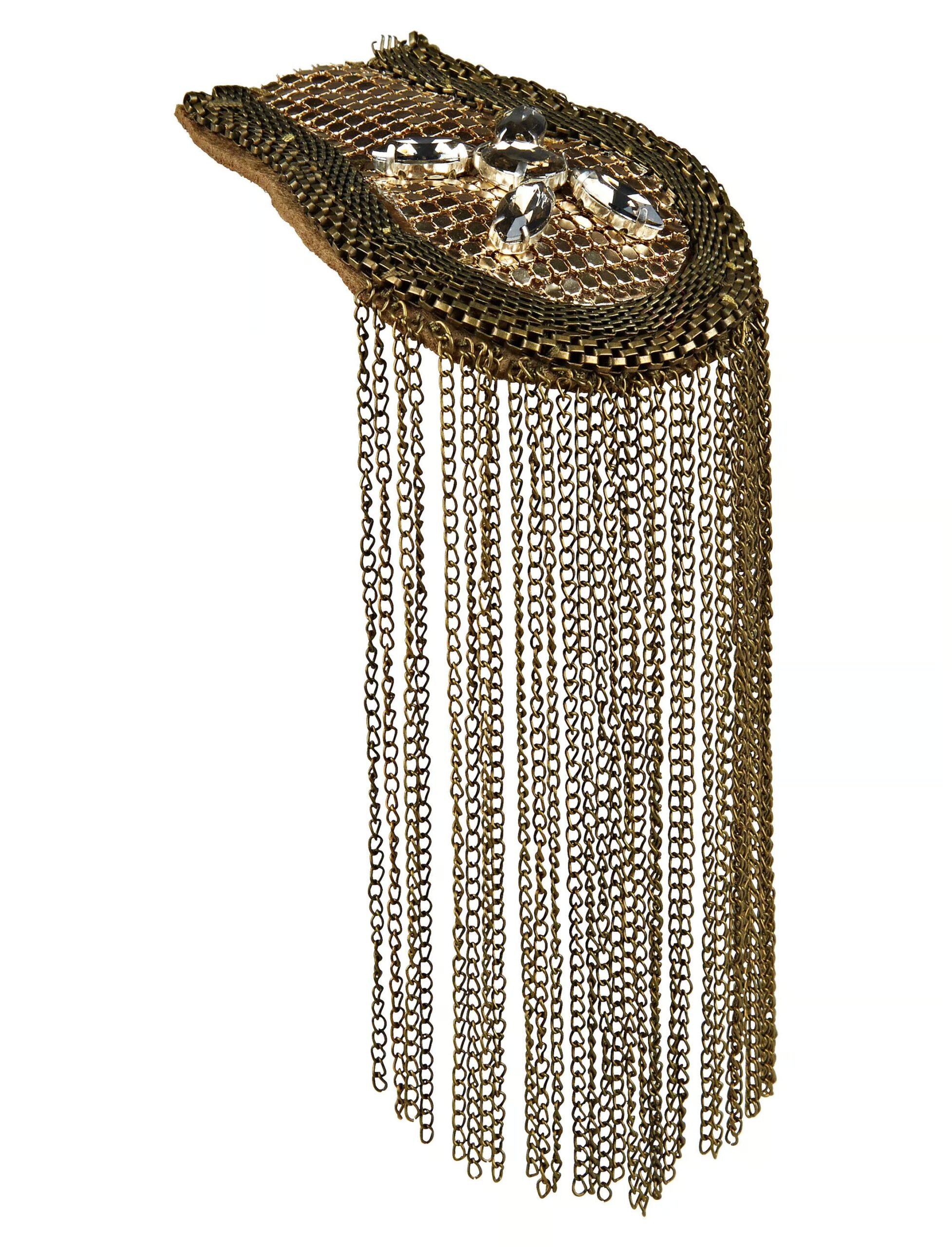 Schulterklappe zum Verlieben: diese Schulterklappe in funkelndem Schwarz/Gold liegt ganz besonders schön auf Deiner Schulter! Die extra langen, metallischen Fransen der Schulterpolster passen zu jeder Uniform, können aber auch von Bauchtänzerinnen und allen anderen Ladies getragen werden. Die perfekte Ergänzung, um stilvoll Deine Schultern zu betonen!