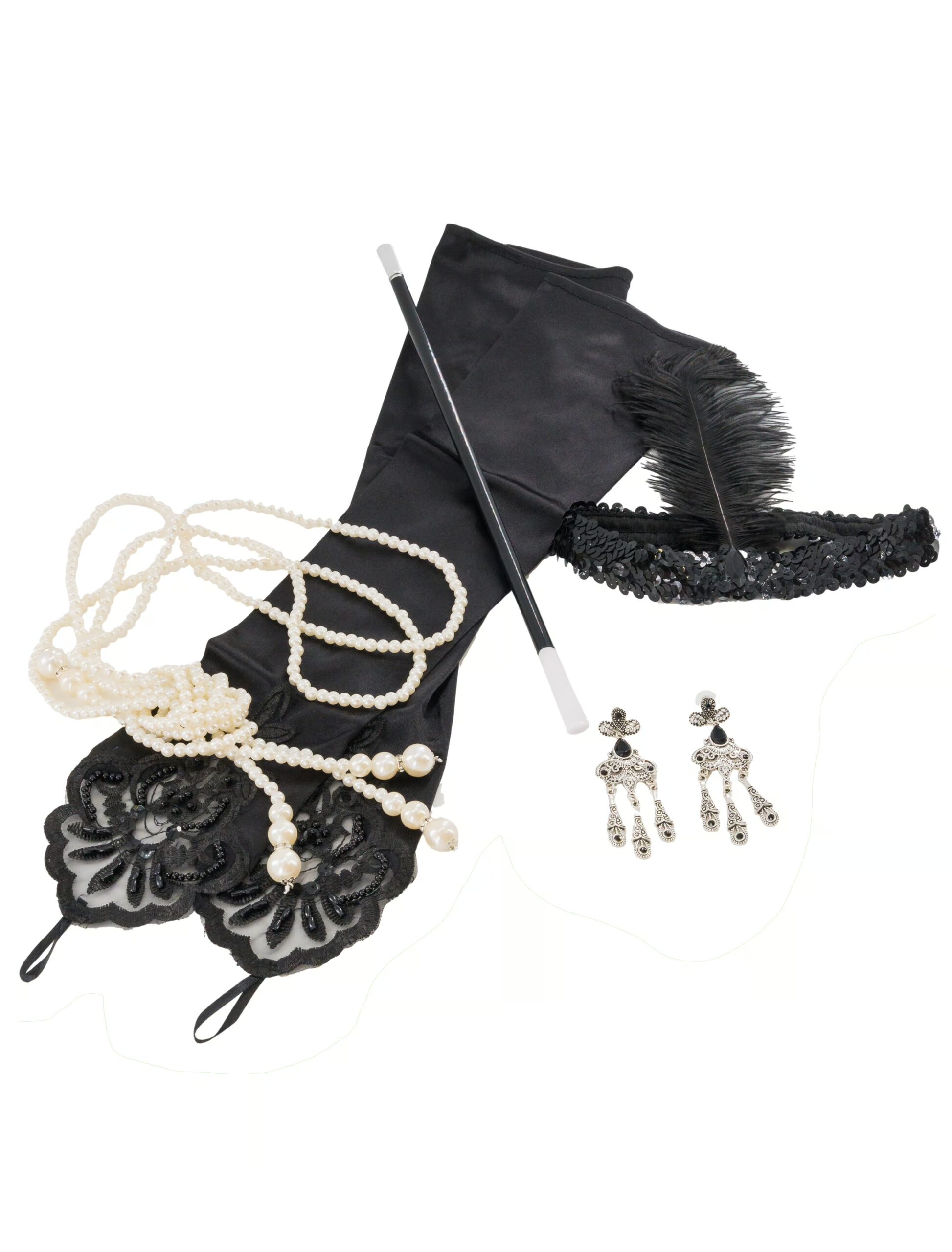 Tauche ein in den Glamour der Goldenen Zwanziger mit unserem stilvollen fünfteiligen Set! Es besteht aus einem Paar eleganter Handschuhe mit Spitzenverzierung und Fingerschlaufe, einer langen, edlen Perlenkette, einer klassischen Zigarettenspitze, kunstvollen Ohrsteckern und einem funkelnden Stirnband mit Federbesatz. Alle Teile sind farblich aufeinander abgestimmt und schaffen zusammen einen authentischen 20er Jahre Look. Ideal für Karneval, Motto-Partys oder stilvolle Retro-Events!