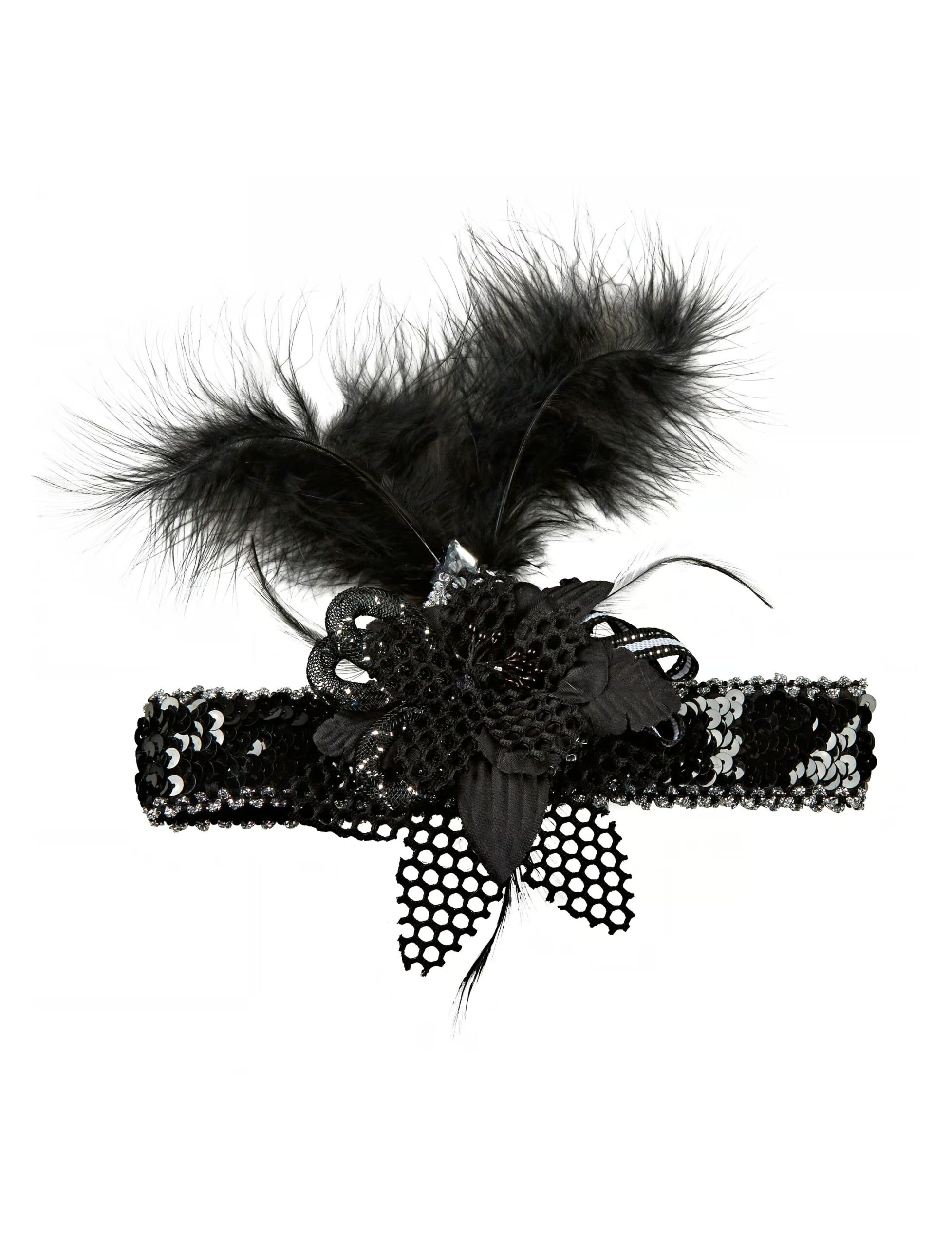 Dieses extravagante Stirnband ist ein besonders hübscher Kopfschmuck für Dein Kostüm! Das schwarze Stirnband ist rundherum mit funkelnden Pailletten bestückt und unter anderem mit echten Federn verziert. Perfekt für Dein elegantes Outfit als Tänzerin!