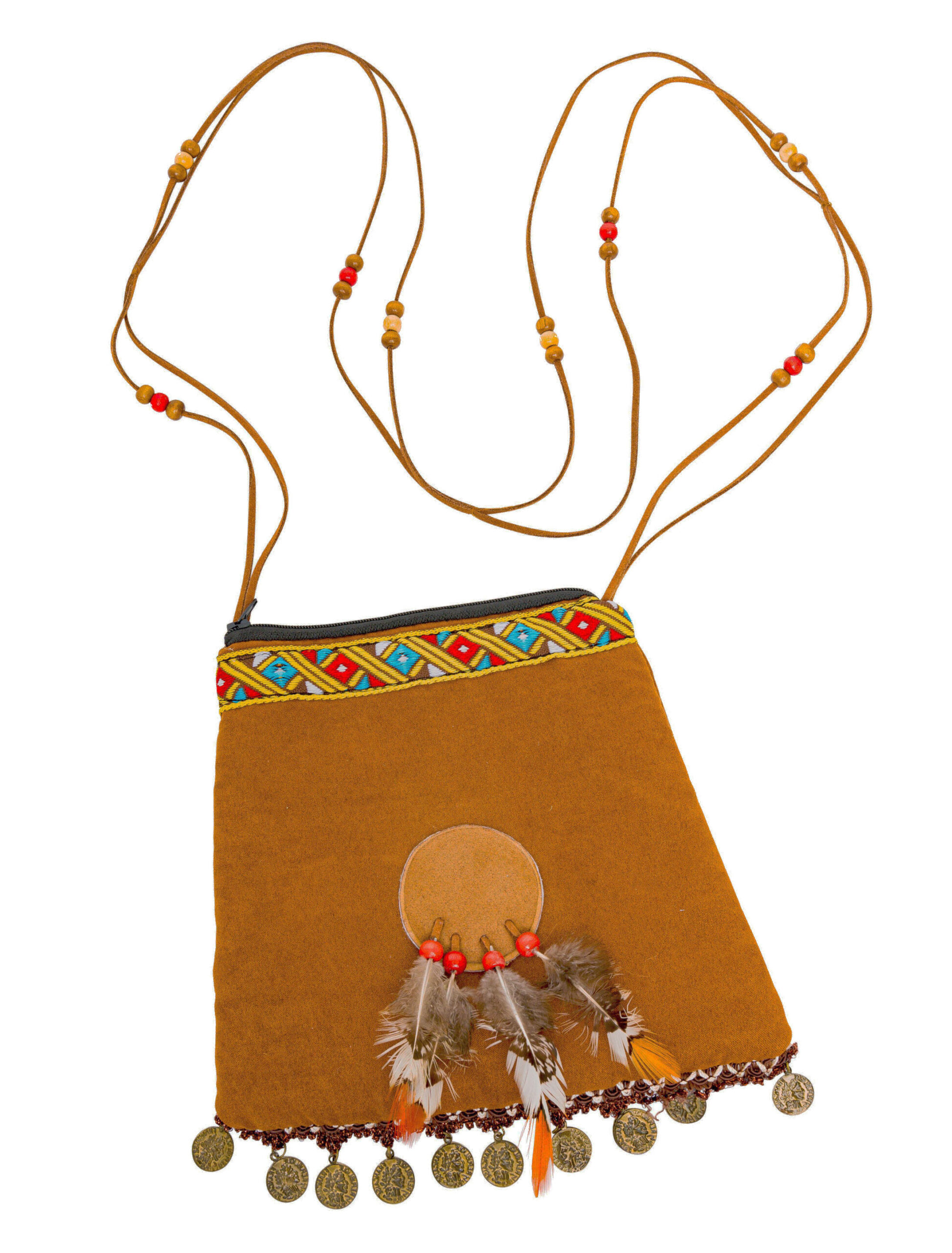 Du kennst es sicher auch: Dein Indianer-Kostüm steht bereits, aber Dir fehlt immer noch die passende Tasche, die Deinen authentischen Look perfekt ergänzt. Da kommt dieses Accessoire wie gerufen! Die braune Indianer-Tasche wird von bunten Stickereien, Münzen und Federn geschmückt. Die Träger bestehen aus filigranen Bändern, die mit bunten Perlen verziert sind. Durch den Reißverschluss kannst Du Deine Wertsachen sicher aufbewahren. Ein Must-Have für stilbewusste Indianerinnen!