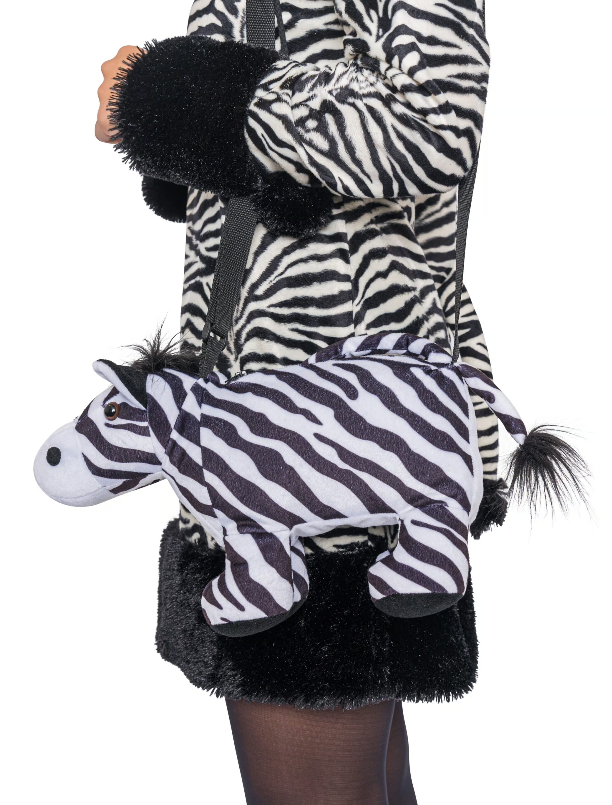 Die Tasche Zebra aus Plüsch ist in den Farben schwarz und weiß gehalten. Du kannst sie zu Deinem Zebra Kostüm als ideales Transportmittel, um ein paar Kleinigkeiten darin zu verstauen, kombinieren. Sie hat eine Abmessung von 16 x 10 cm, das Zebra an sich ist 46 x 22 cm groß. Die Tasch ist aus 100% Polyester gefertigt.