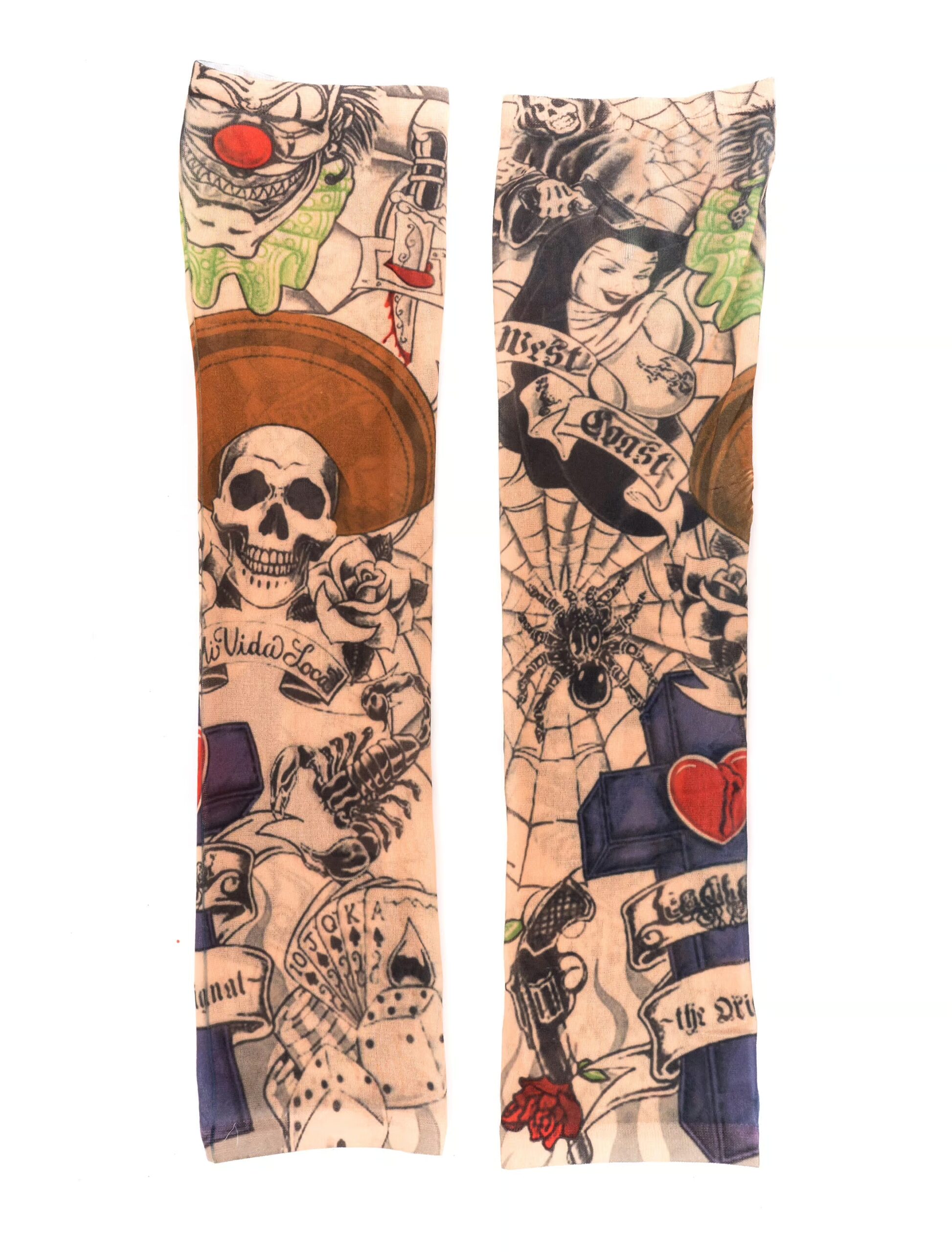 Hochwertige Armstulpen Spinnweben & weiteren Motiven Du bist zu einer Kostümparty eingeladen und suchst nach einem exklusiven Accessoire, warum dann nicht einmal auffallen mit zwei Tattoo Armstulpen. Die schwarz-bunten Stulpen sind mit Spinnweben, Totenköpfen und Dia de los Muertos Motiven bedruckt. Sie wird zu 100 Prozent aus Polyester gefertigt und ist ca. 37 cm lang. In der Packung ist nur eine Armstulpe enthalten. Die Tattoo-Stulpe macht Dein Outfit einzigartig und die Halloweenparty kann beginnen.