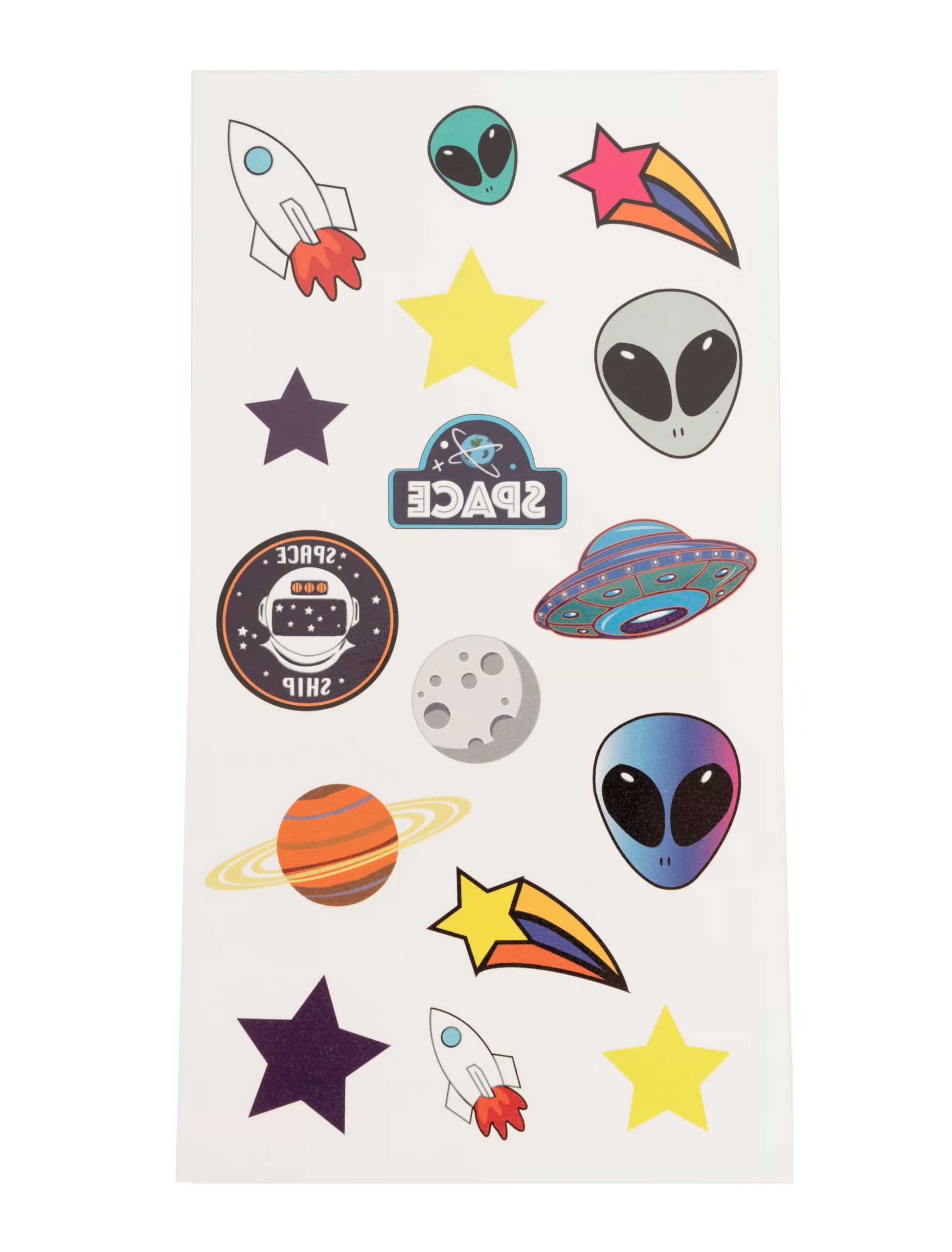 Mach das Thema Space, Weltall oder Marsmensch zu Deinem Thema an Karneval und Fasching. Diese Tattoos Space Außerirdische sind ein echter Hingucker. Die 16 Tattoos haben eine Größe von ca. 2 – 4,5 cm. Motive wie Space-Köpfe, UFOs, Sterne oder Planeten. Tattoos für Erwachsene und Kinder. Ideal für Karneval und Fasching!