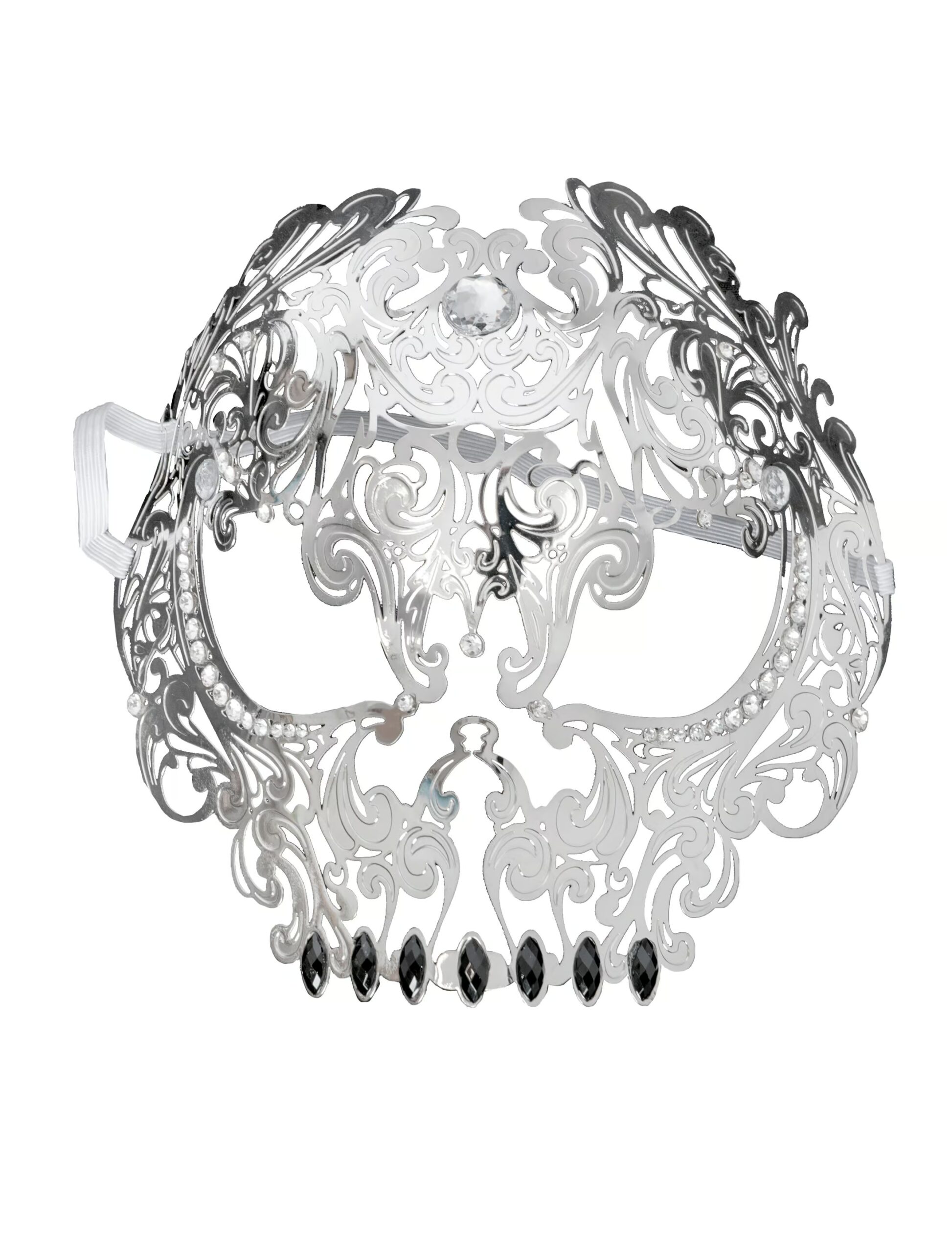 Du bist zu einer Halloweenparty eingeladen und suchst noch den letzten Schliff für Deine schaurige Verkleidung? Gar kein Problem! Unsere silberne Totenkopf Vollmaske mit schwarzen Kristallen darf hier nicht fehlen. Diese Maske passt perfekt zu Deinem extravaganten Halloween Kostüm. Die Maske ist aus Metall gefertigt und ist mit einem Gummiband ausgestattet. Das Produkt beinhaltet nur eine Maske.