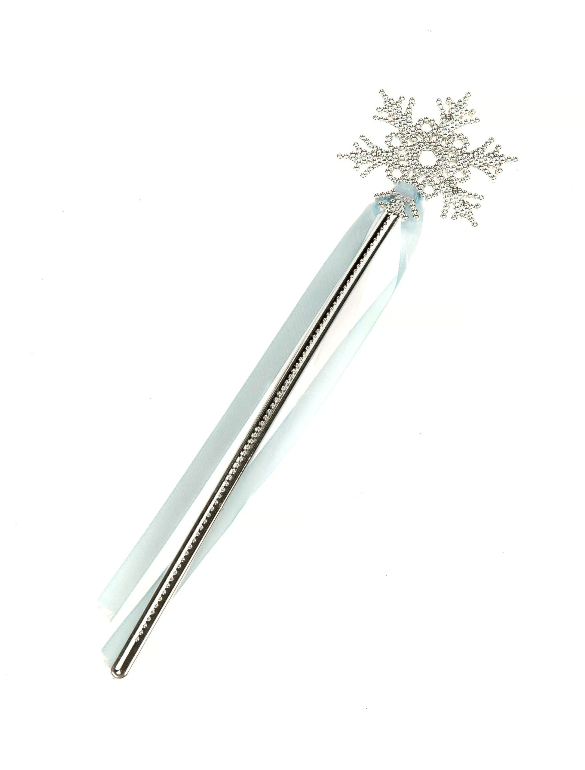 Egal ob Eiskönigin, Zauberfee oder eiskalte Hexe: mit diesem herrlichen Zauberstab gibst Du Deinem magischen Kostüm den letzten Schliff! Der silberne Stab ist aus Plastik gefertigt und mit einer prächtigen Schneeflocke sowie hellblauen Bändern verziert. Die perfekte Ergänzung für Dein Karnevals- oder Halloween-Outfit!