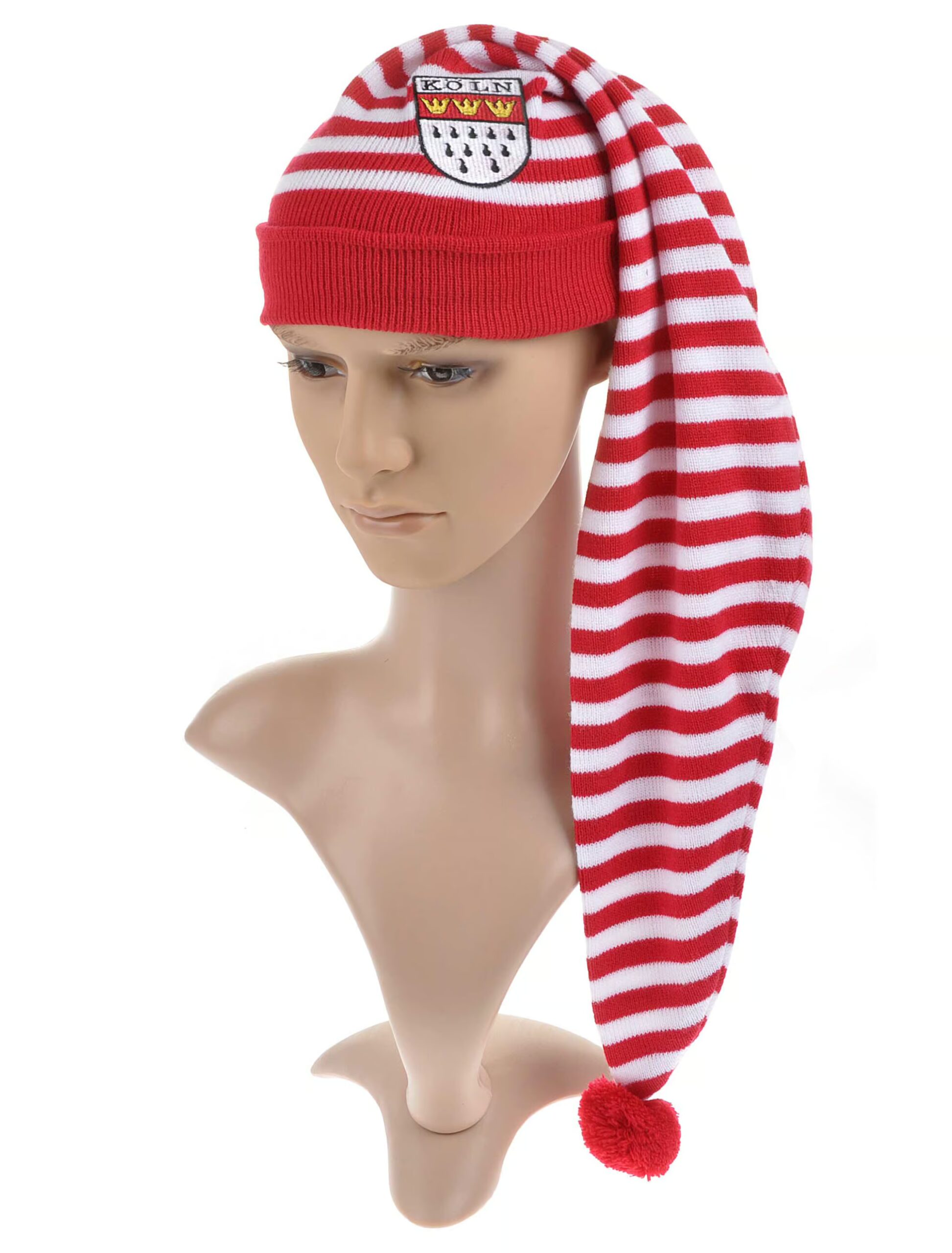 Nicht nur was für echte kölsche Jung ist diese geniale Mütze. Die Zipfelmütze Köln mit dem Wappen in Rot und Weiß zeigt, für welche Stadt Dein Herz schlägt. Lustige Details sind die Ringelstreifen und der Bommel an der Spitze der Mütze. Die Mütze hält warm auf den typischen Karnevalsumzügen der Stadt und ist auch nach der Narrenzeit ein tolles Accessoire. In der Einheitsgröße One Size gibt es den Tragespaß für alle Köln-Fans. Ein lautes Kölle Alaaf für die Zipfelmütze Köln mit dem rot-weißen Wappen!