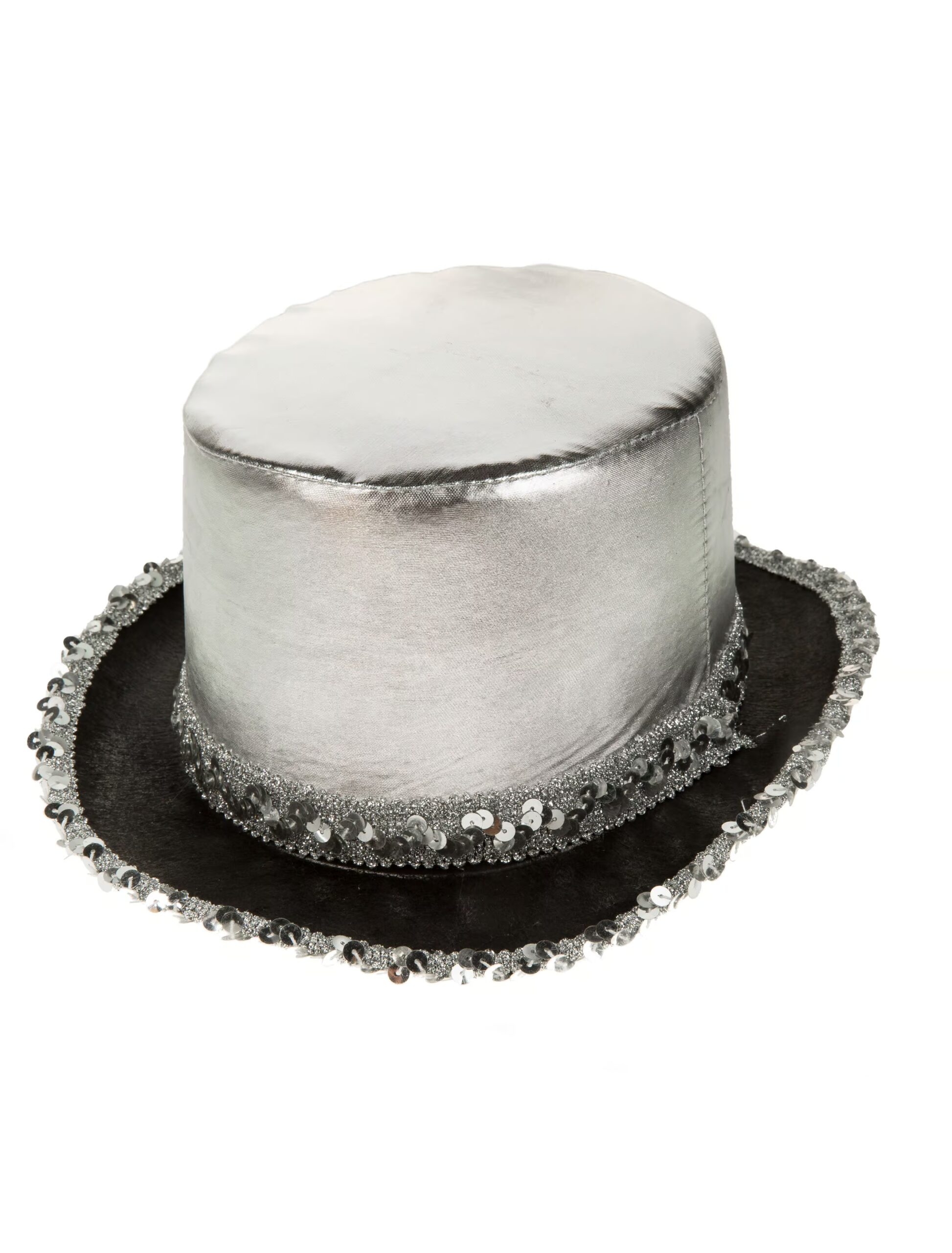 Mut zum Hut! Dieser herrliche, silberne Zylinder ist mit einem glänzenden Lamé Stoff aus Polyester gefertigt. Die Krempe ist rundherum mit glitzernden Pailletten verziert. Die silberne Kopfbedeckung lässt sich perfekt mit zahlreichen Accessoires und Kostümen aus unserem Shop kombinieren!