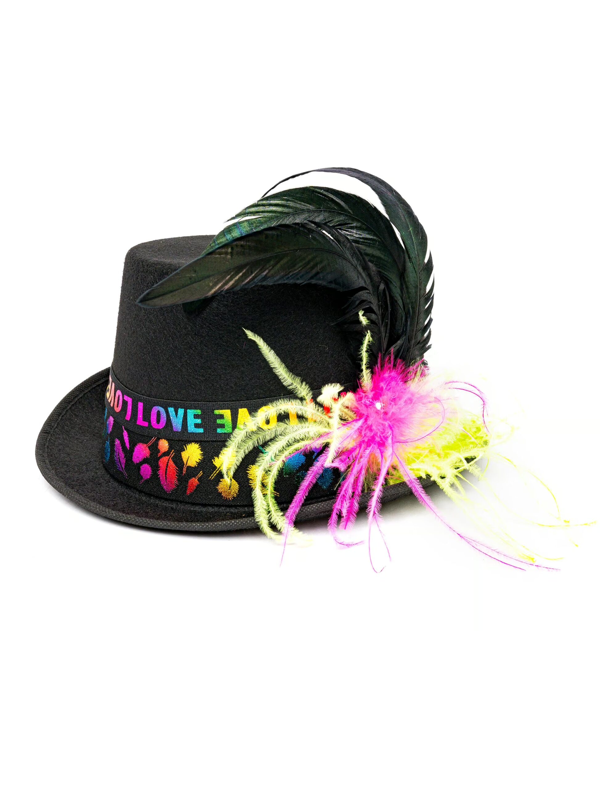 Love is in the air! Mit diesem extravaganten Hut rockst Du jede Motto- oder Karnevalsparty. Der schwarze Zylinder ist mit einem bunten Hutband verziert, welches rundum die Schriftzüge LOVE†trägt und mit bunten Federn bedruckt ist. Passend dazu ist der Hut seitlich mit schwarzen, pinken und gelben Federn verziert. Ein schriller Hingucker, der jede Tanzfläche zum Strahlen bringt und jedes Kostüm in einen Hingucker verwandelt.