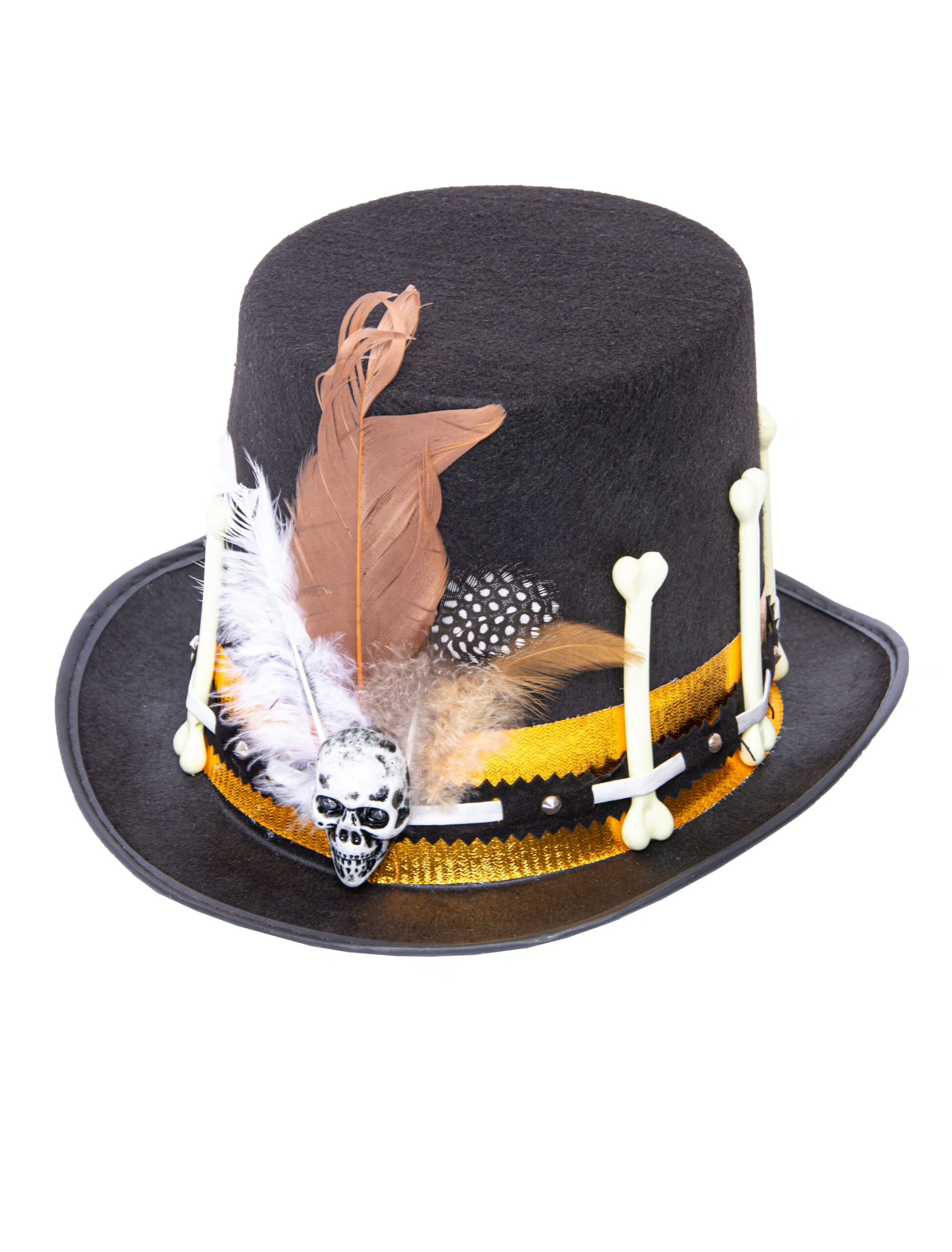 Mit diesem Hut erhält jedes Kostüm eine ganz besondere Note und vor allem an Halloween wirst Du damit zum echten Hingucker. Der Zylinder ist 15 cm hoch. Er ist schwarz und sowohl mit einem goldenen Hutband und einer schwarzen Borte sowie mit einem Totenkopf, Knochen und Federn verziert. Der Artikel besteht zu 99 Prozent aus Polyester und zu 1 Prozent aus Federn.