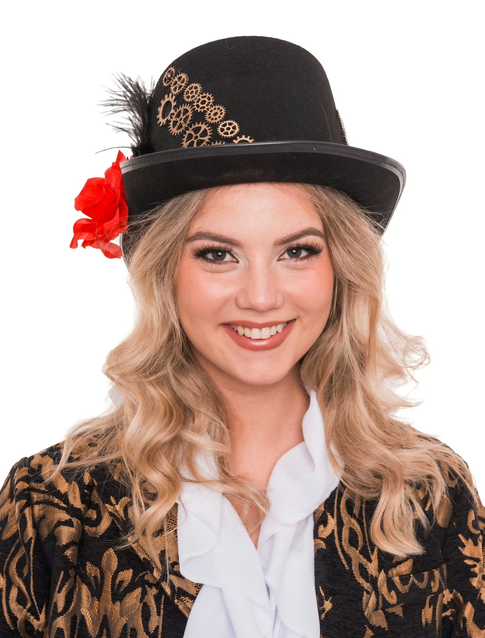 Dieser elegante Zylinder ist ein echtes Highlight für Steampunk- und Retro-Liebhaber. Verziert mit filigranen Zahnrädern in Metalloptik, einer auffälligen Blume und feinen schwarzen Federn, vereint er Industrial-Charme mit verspielter Eleganz. Ob als Accessoire für ein aufwendiges Steampunk-Kostüm, viktorianische Outfits oder extravagante Party-Looks – dieser Hut verleiht deinem Auftritt das gewisse Etwas und sorgt garantiert für neugierige Blicke.