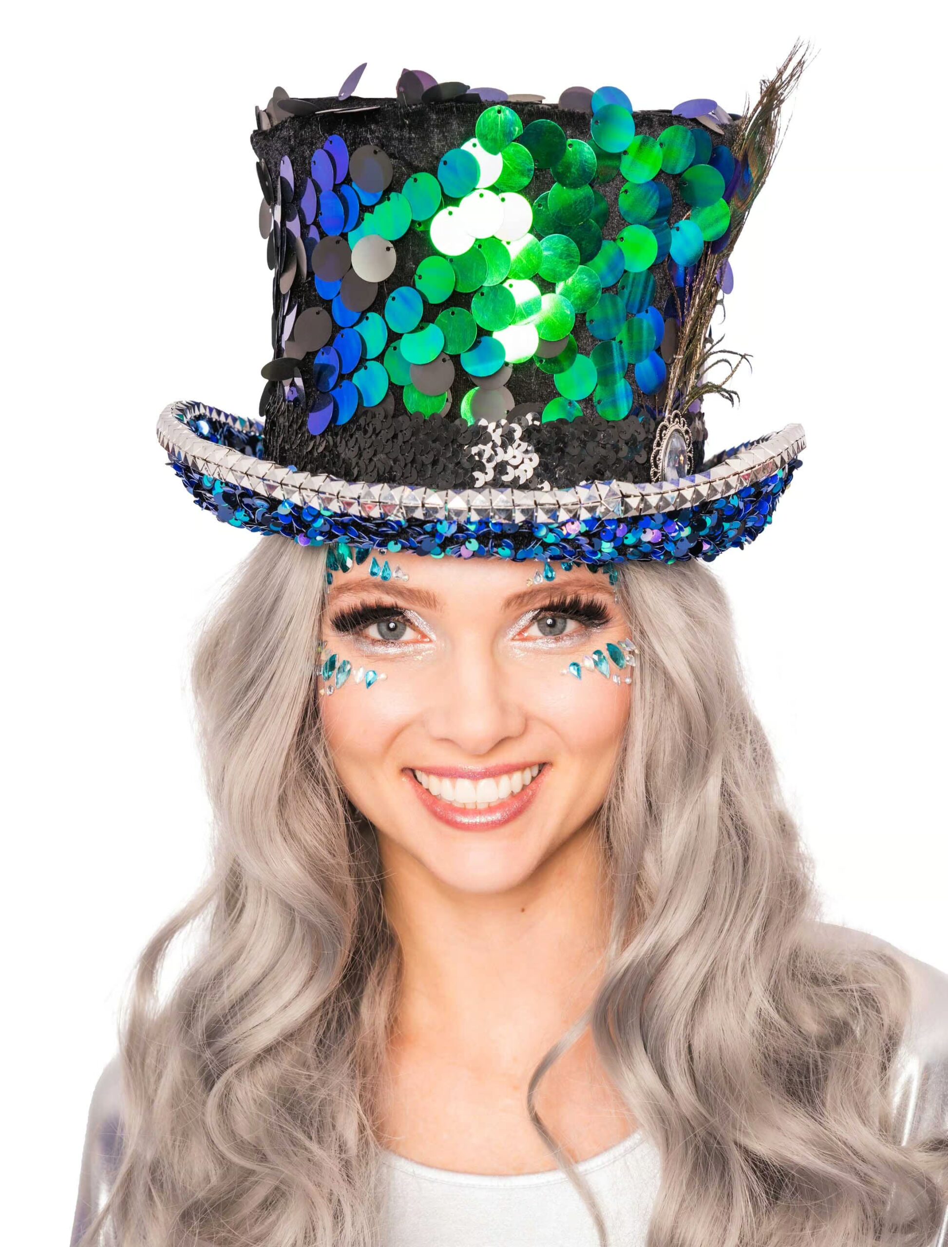Der qualitativ hochwertig verarbeitete Zylinder beeindruckt mit einer eindrucksvollen Mischung aus funkelnden Pailletten in Aqua-, Grün- und Lilatönen sowie in Schwarz, rockigen silberfarbenen Nieten und einem glamourösem Design mit potentiellem Wow-Effekt. Als zusätzliches visuelles Highlight schmückt die Kopfbedeckung eine echte Pfauenfeder, die den Zylinder edel in Szene setzt. Die aufwändigen Verzierungen ziehen die Blicke magisch an, sodass Du Dir an Halloween oder im Karneval bzw. Fasching der kollektiven Aufmerksamkeit sicher sein kannst.