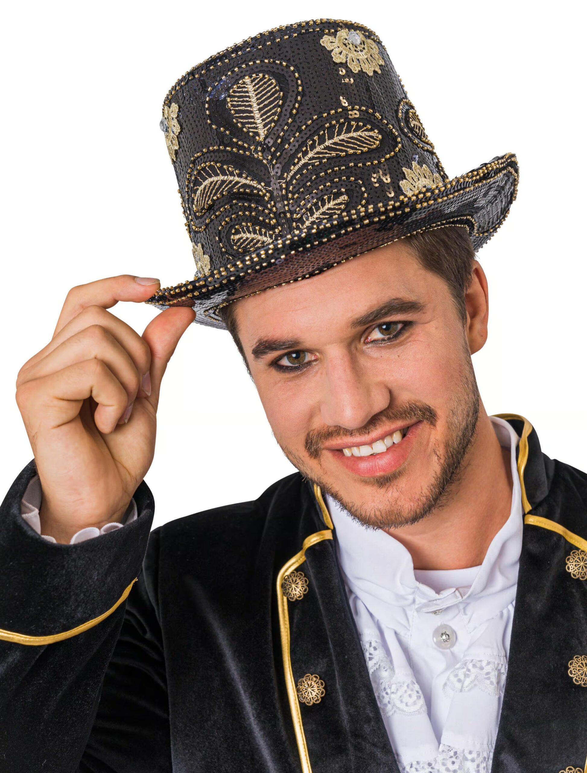 Schicker deluxe Zylinder, dem jeder Mann und jede Frau gut stehen wird. Die Kopfbedeckung wird von schwarzen Pailletten geziert, die dem Hut einen extravaganten Look verleihen. Zusätzlich wird er von floralen Stickereien und funkelnden Strasssteinchen geschmückt. Perfekt für alle, die auf der kommenden Karnevalsparty als Zauberer oder Magier im Mittelpunkt stehen möchten.