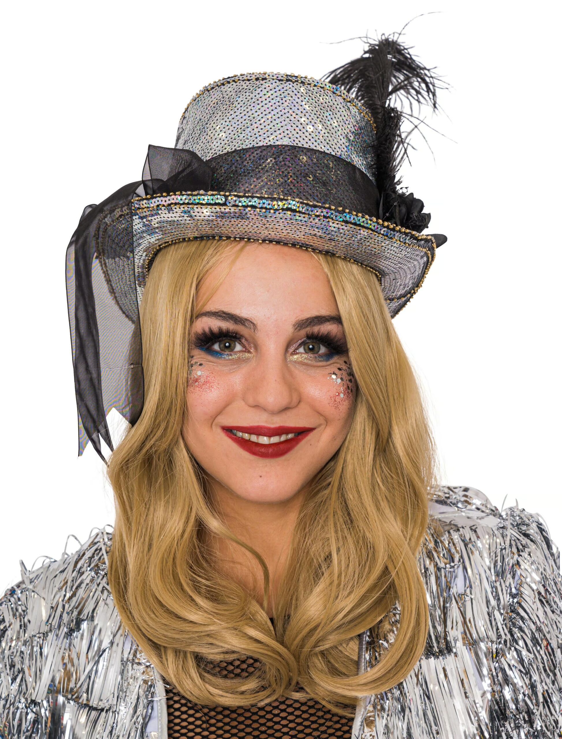 Mit diesem Hut stehst Du garantiert überall im Mittelpunkt! Das schicke Exemplar wird rundum von silberfarbenen Pailletten, die Licht schön reflektieren, geziert. Weitere Highlights sind nicht nur das schwarze Hutband mit der Schleife auf der linken Seite, sondern auch die große, schwarze Feder und die schwarze Blume, die beide die andere Seite des Zylinders schmücken. Ein aufregender Blickfang!