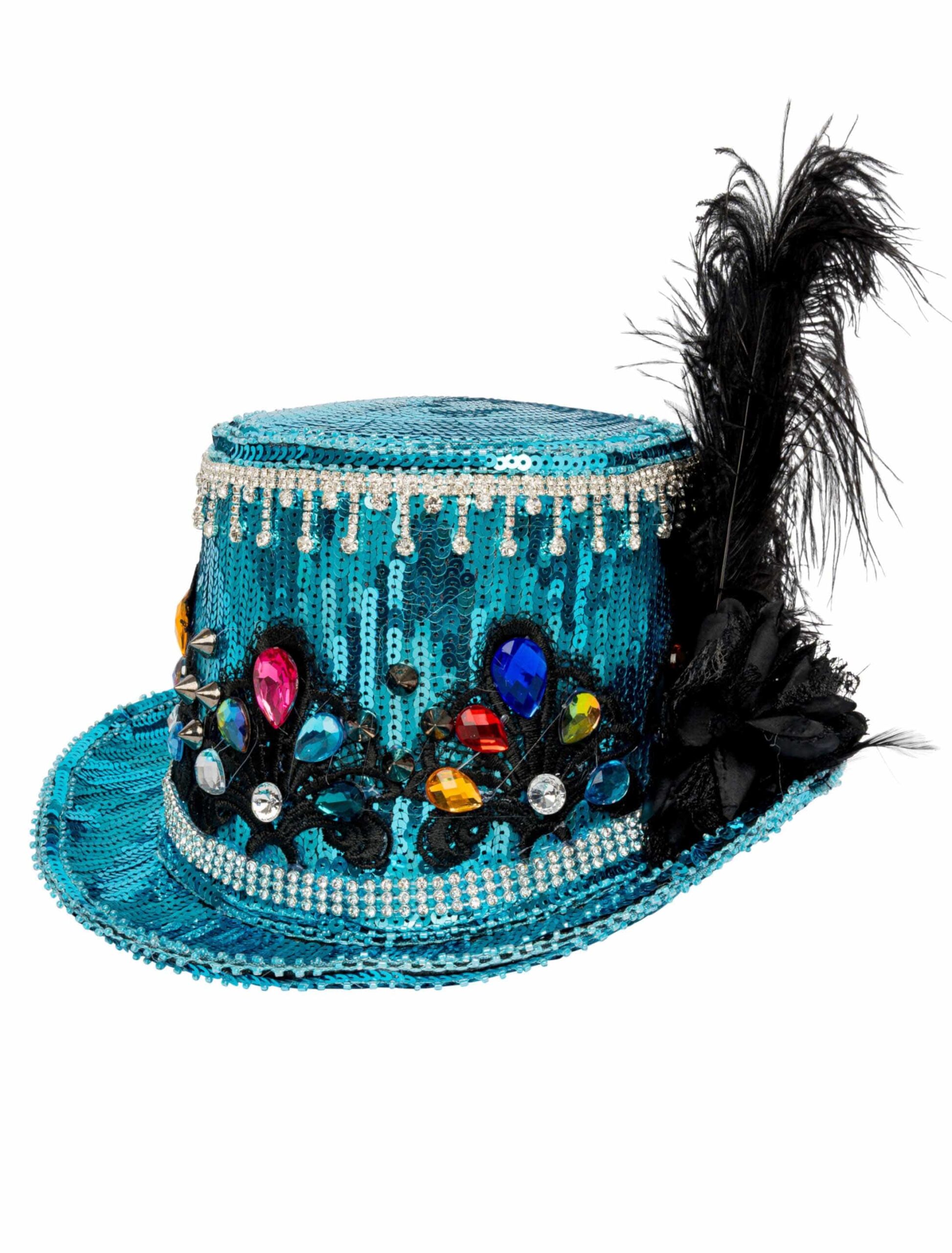 Hier ist einiges los! Beim Anblick dieses extravaganten Zylinders kannst Du Dich einfach nicht entscheiden, was Du am schönsten findest: Die schillernden, türkisfarbenen Pailletten, die den gesamten Hut zieren, die weißen Perlen, die so edel aussehen, die schwarzen Federn und Bänder seitlich des Hutes oder doch die hübschen, bunten Steine? Egal, denn Du musst Dich nicht entscheiden. Perfekt für alle Damen, die außergewöhnliche Accessoires lieben!