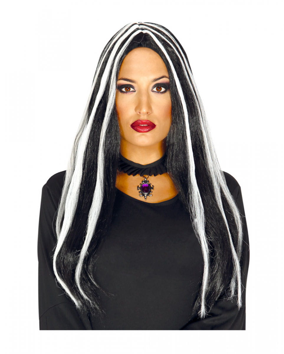 Gesträhnte Hexen-Langhaarperücke als Kostümzubehör für Halloween, Fasching und Gothic-Fans Schwarze Hexenperücke aus Kunsthaar mit weißen Strähnen Mit der Hexen Langhaar Perücke Mary kannst du auf der nächsten Walpurgisnacht einen magischen Auftritt hinlegen. Die edle Hexenperücke ist auch das ideale Kostümzubehör für Halloween und Karneval. Die schwarze Hexen Langhaar Perücke mit den weißen Strähnen steht jeder Gothic-Hexe gut zu Gesicht – das glänzende Kunsthaar reicht verführerisch lang bis weit über die Schultern. Lieferumfang: 1 x Hexen Langhaar Perücke Mary Inhalt: 1 Stück Farbe: Schwarz/Weiß Größe: One Size für Damen Material: 100% Kunsthaar Halsband und Oberteil nicht inklusive Stylische Hexenperücke für Halloween und Gothic-Fans Der Artikel ist ein Kostümzubehör für Erwachsene und kein Spielzeug. Nicht für Kinder unter 3 Jahren geeignet. Kann Kleinteile enthalten, die verschluckt werden können – Erstickungsgefahr. Von Feuer und offenen Flammen fernhalten.