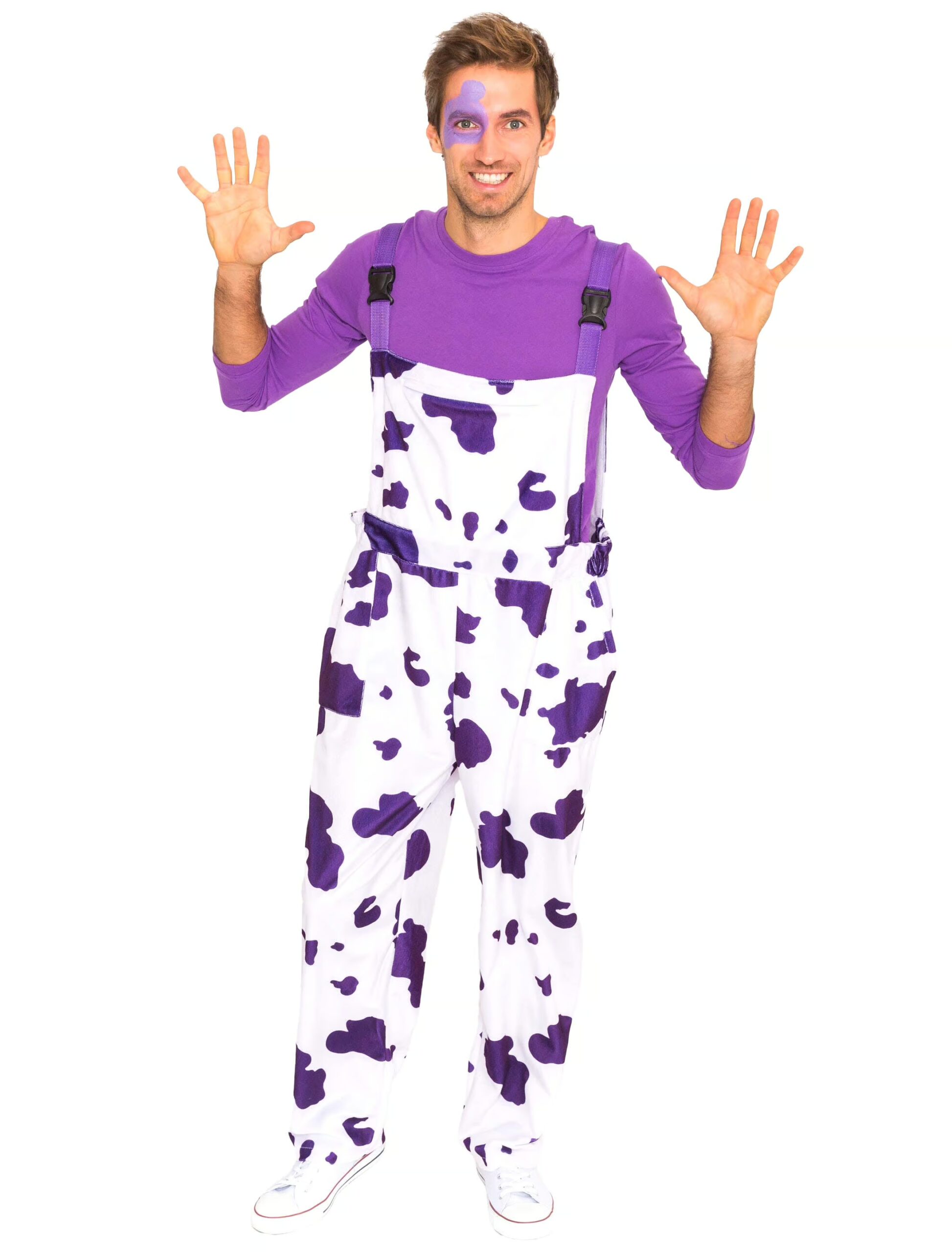 Als ausgefallene Kuh in den Farben Weiß und Lila kannst Du Dich mit unserer coolen gefleckten Latzhose verkleiden. Egal ob an Karneval oder auf einer tierischen Mottoparty, die Hose mit Trägern sorgt für jede Menge Spaß und Heiterkeit beim Feiern. Sowohl für Damen, als auch für Herren kannst Du die Latzhose im Cow Design bei uns im Shop erwerben. Das passende Oberteil kann in den Farben Lila oder Weiß gewählt werden. Für Sie und Ihn.