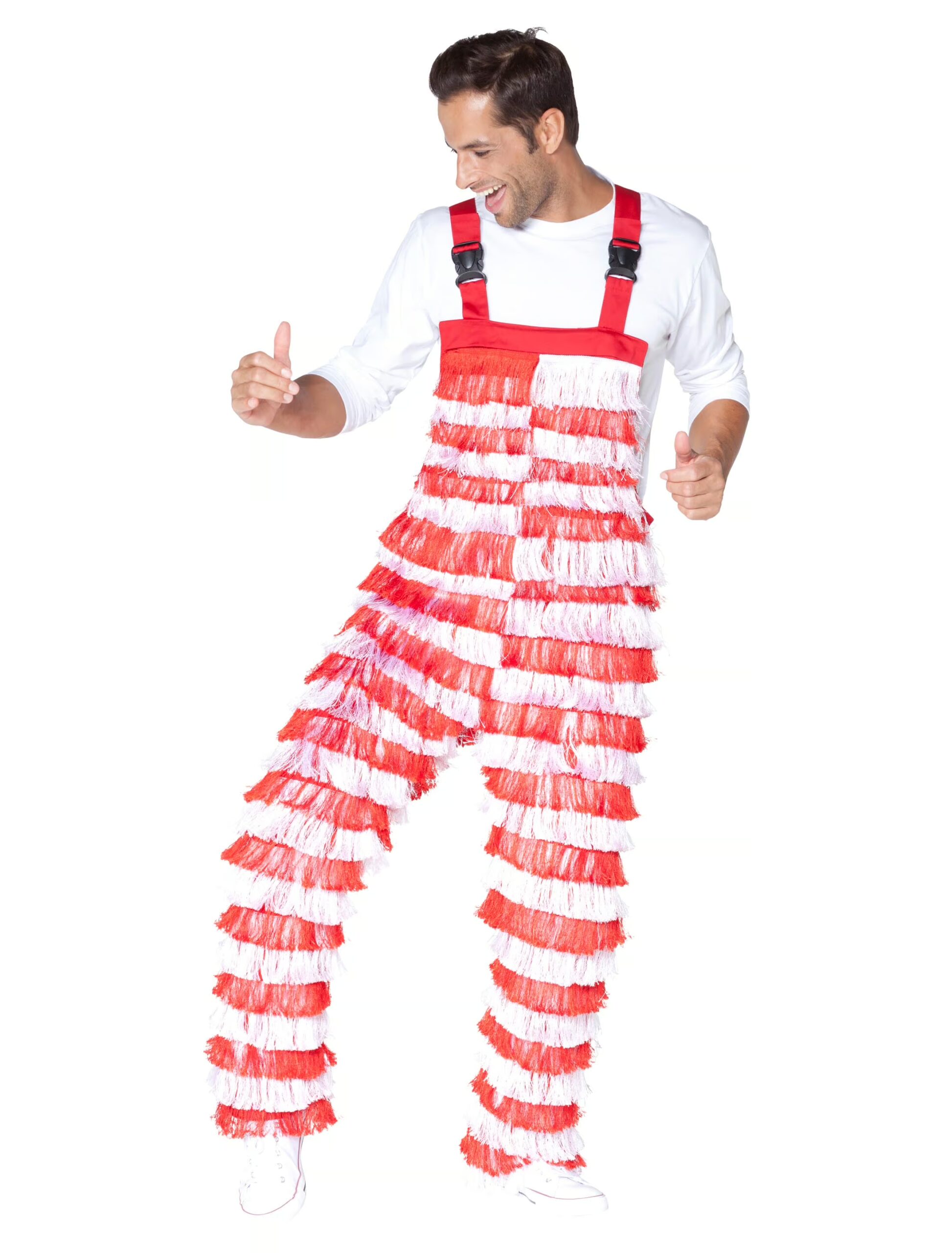 In den Kölner Stadtfarben zeigst Du allen, wie sehr Du deine Stadt liebst!! Diese rot-weiße Latzhose ist nicht nur sehr bequem, sondern sieht auch super aus. Rundum ist sie mit roten und weißen Fransen verziert, die einander abwechseln und einen tollen Kontrast zueinander bilden. Bei jeder Deiner Bewegungen schwingen die Fransen dynamisch mit und sorgen für Partylaune. Durch die beiden Clip-Schnallen lassen sich die Träger bequem schließen und die Länge der Träger individuell regulieren. Somit sitzt die Latzhose den ganzen Tag perfekt. Im Brustbereich befindet sich eine praktische Tasche mit Reißverschluss. Kombiniert mit einer roten Perücke, einem weißen Longsleeve und passender Schminke wirst du zum echten kölsche Mädsche oder kölsche Jung. Diese Latzhose eignet sich auch perfekt als Partnerkostüm! In den typischen Kölner Stadtfarben wird jede Karnevalsparty zum Erfolg!