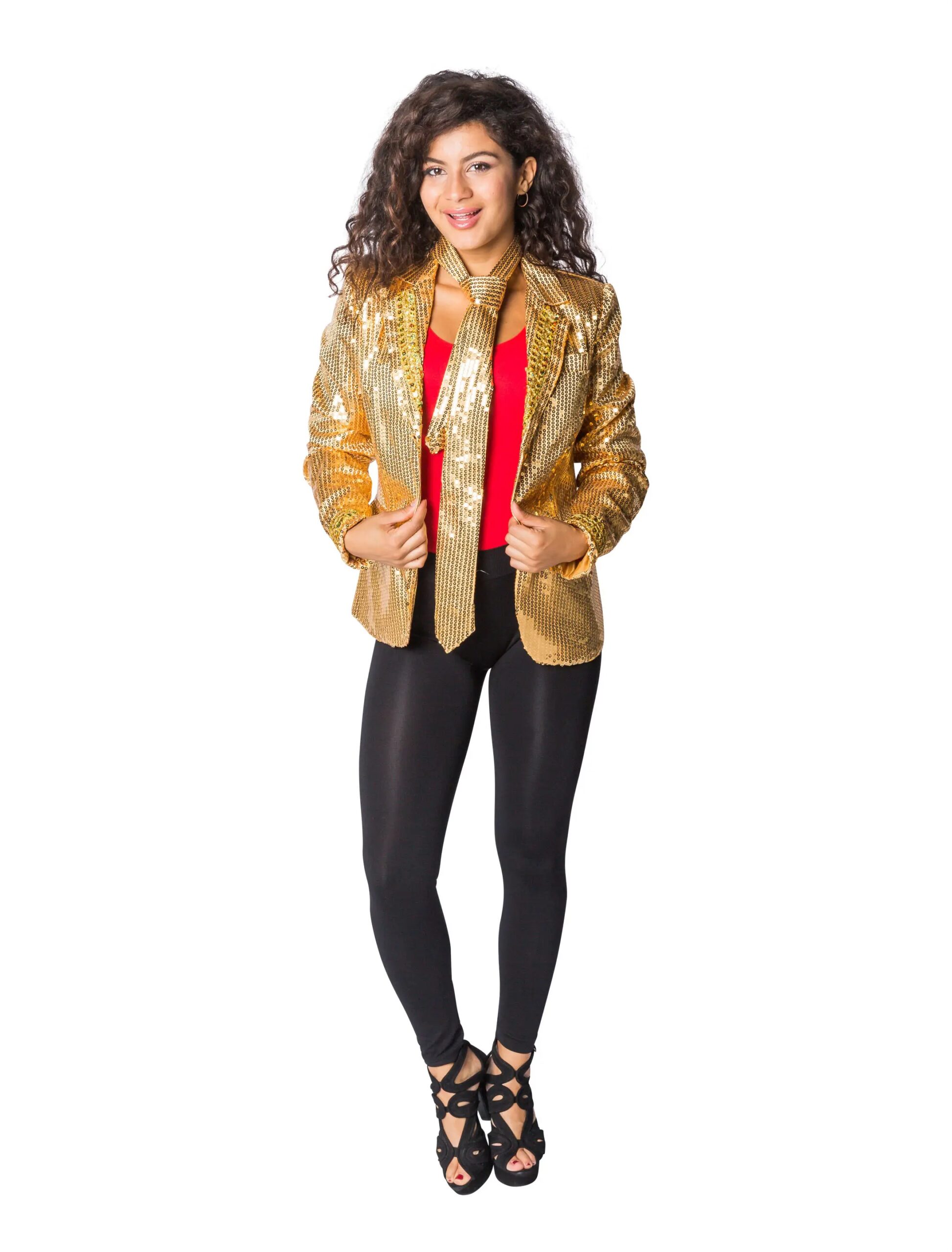 Du kannst gar nicht genug von Glitzer und Glamour bekommen? Dann wirst Du diese schillernde Damen Jacke lieben! Rundum ist die etwas länger geschnittene Jacke mit den langen Ärmeln mit goldfarbene Pailletten besetzt, die wunderbar im Licht der Discokugel schillern und um die Wette glänzen. Der tiefe V-Ausschnitt betont wunderbar Dein Dekolletee. Das Highlight sind die bunten LED-Leuchten an den Ärmelenden, am Kragen sowie an den Taschen, so erkennt man Dich direkt auf dem ersten Blick. Ob offen getragen oder zugeknöpft, die goldene Pailletten Jacke ist ein glamouröses Highlight auf jeder Party!