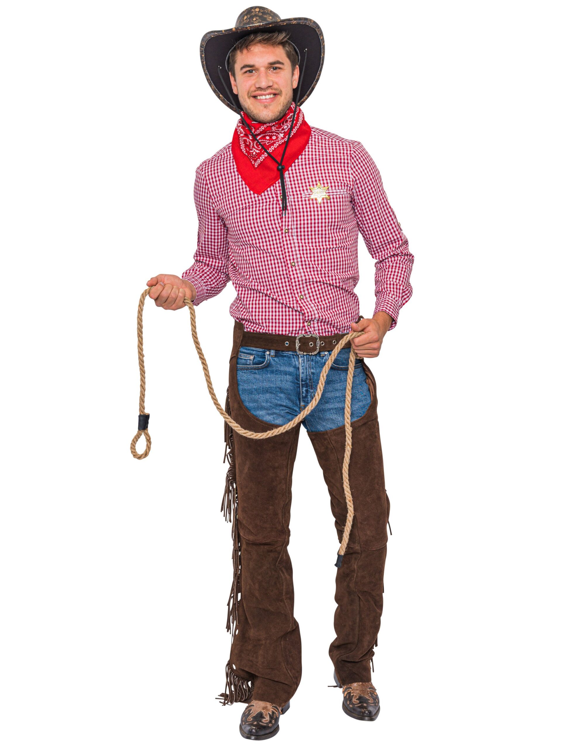 Schicke und praktische Leder-Chaps gehören genauso zum Wild West Outfit wie Cowboyhut und Weste. Mit diesen echten, dunkelbraunen Leder-Chaps in attraktiver Wildlederoptik wird Deine Verkleidung als Cowboy, Sheriff oder Westernheld erst so richtig authentisch. Die Leder Chaps werden über der Jeans getragen und von einem gleichfarbigen Gürtel mit dekorativer, silberfarbener Dornschließe gehalten. Wirkungsvolle Fransen und Druckknöpfe zieren die Seitennähte und verdecken die darunter befindlichen Reißverschlüsse. Ein edles Kostümteil, das Dein Cowboy- oder Cowgirlkostüm nicht nur perfekt ergänzt, sondern auch Aufmerksamkeit erregt.
