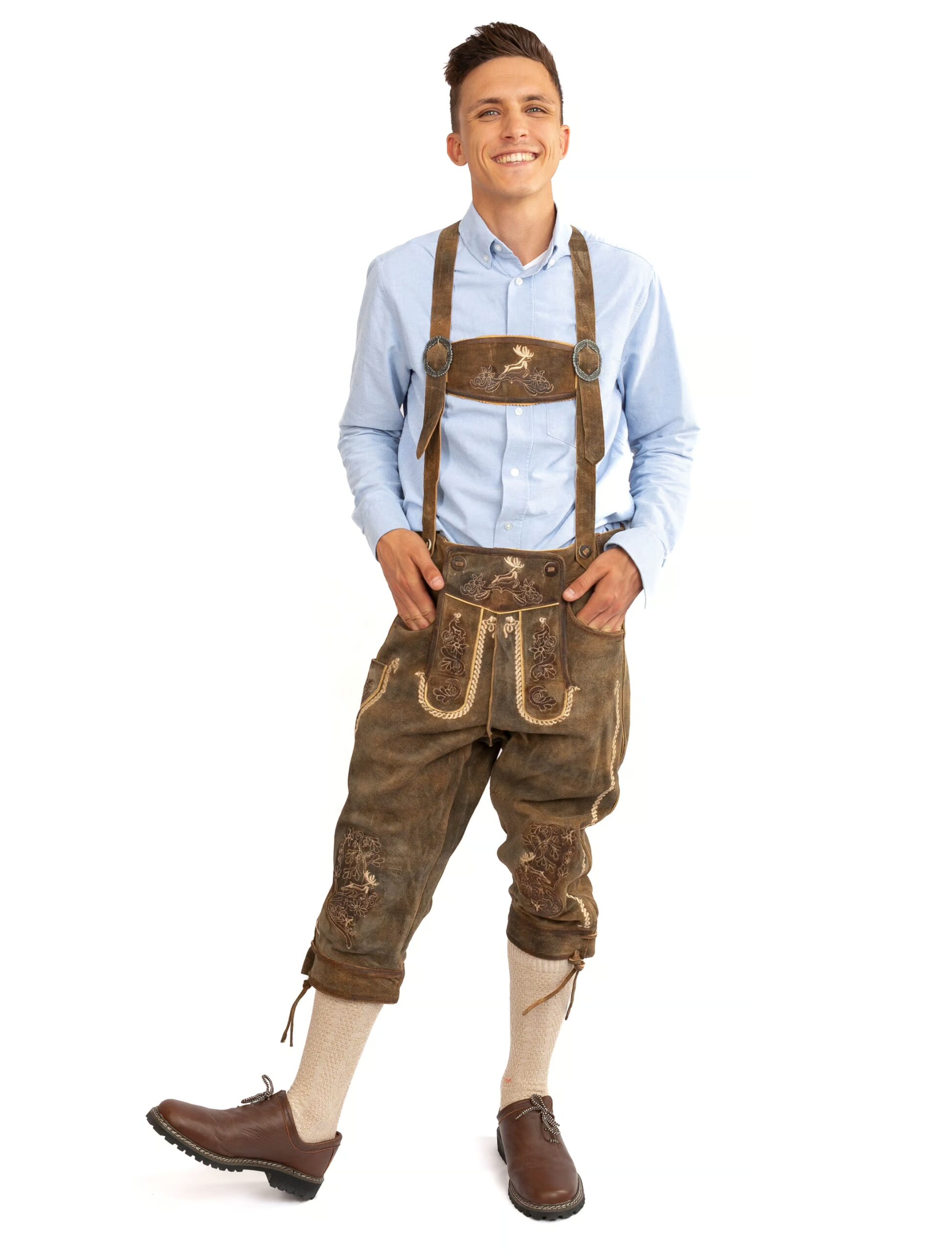 Die Lederhose Frank besticht durch ihre zeitlose Eleganz und ihren traditionellen Charme. Gefertigt aus hochwertigem, robustem Leder, bietet sie sowohl Komfort als auch eine hervorragende Passform. Das Leder ist sorgfältig verarbeitet und sorgt für ein angenehmes Tragegefühl bei jeder Gelegenheit. Mit klassischen Hornknöpfen und dezenten Stickereien an den Beinabschlüssen wird der authentische Trachtenlook unterstrichen. Der praktische Reißverschluss ersetzt den traditionellen Latz und sorgt für eine moderne, bequeme Passform. Dank der Schnürungen am Bund und an den Beinabschlüssen lässt sich die Lederhose Frank individuell anpassen. Ein Gürtel mit einer altsilbernen Hirschschnalle rundet das Design perfekt ab. Ideal für das Oktoberfest, Karneval oder andere festliche Anlässe – die Lederhose Frank ist ein vielseitiger Klassiker, der sich perfekt in jedes Trachtenoutfit integriert.