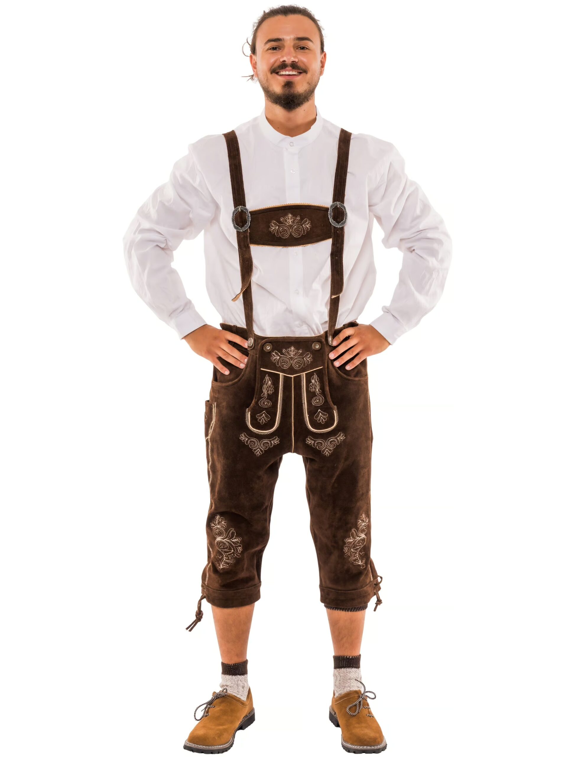 O’zapft ist! Ob auf dem Volksfest, an Karneval oder auf Deiner Mottoparty im Bierzelt, mit dieser Trachtenhose bist Du garantiert perfekt gekleidet! Die aufwendig verarbeitete und hochwertige Lederhose besteht aus 100% echtem Leder. Die Hose ist dunkelbraun und sehr schick und elegant geschnitten. Die Hosenbeine reichen bis zu den Waden und lasen sich über praktische Schnürungen ideal anpassen. An beiden Beinlängen befinden sich aufwendige Nähte und die traditionelle Nicker-Tasche am rechten Hosenbein verleiht Dir den typisch traditionellen Look! Eine praktische Gesäßtasche, sowie Stickereien und verzierte Nähte ziehen sich über den Gesäßbereich und betonen es so ideal. Der Hosenlatz ist mit passenden Stickereien verziert und über Knöpfe aus Horn am Bund der Hose befestigt. Die Träger sind der besondere Hingucker der Hose, da sie anders als andere Modelle im Bauchbereich aufgeteilt und so mittig sowie an beiden Seiten des Hosenlatzes über Knöpfe aus Horn an der Hose befestigt werden.