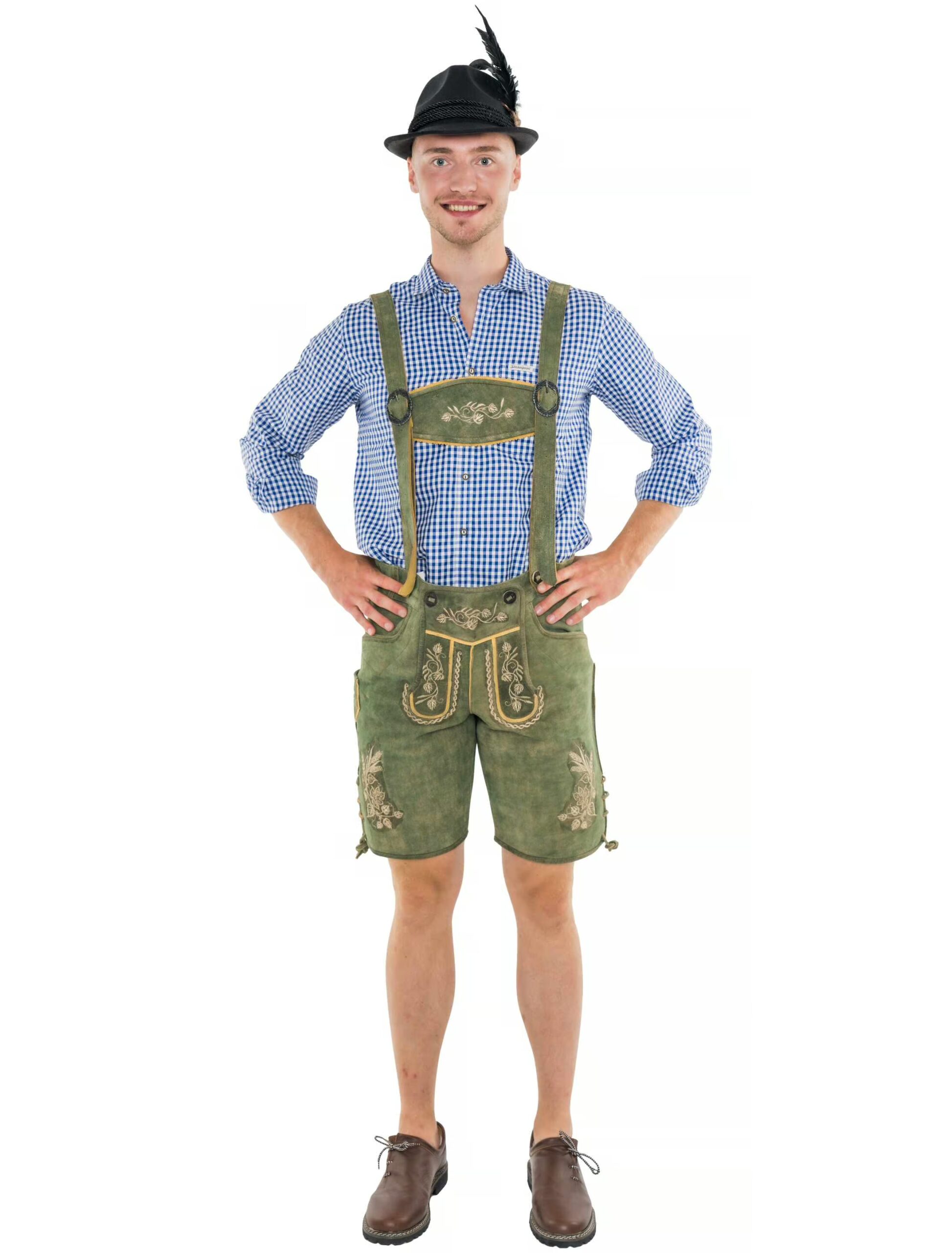 Werde der König der Wiesn – Mit unserer kurzen Herren Lederhose mit Hosenträgern bist du nicht nur passend gekleidet, sondern bringst auch eine ordentliche Portion Charme und Stil mit! Die edlen Stickereien im dezenten Blumenmuster sind der perfekte Mix aus traditionell und modern. Perfekt kombinierbar mit einem lockeren Hemd, einem lässigen Grinsen und, na klar, einer Maß in der Hand. Ob Oktoberfest oder Mottoparty – dieses Teil bringt dich überall hin!