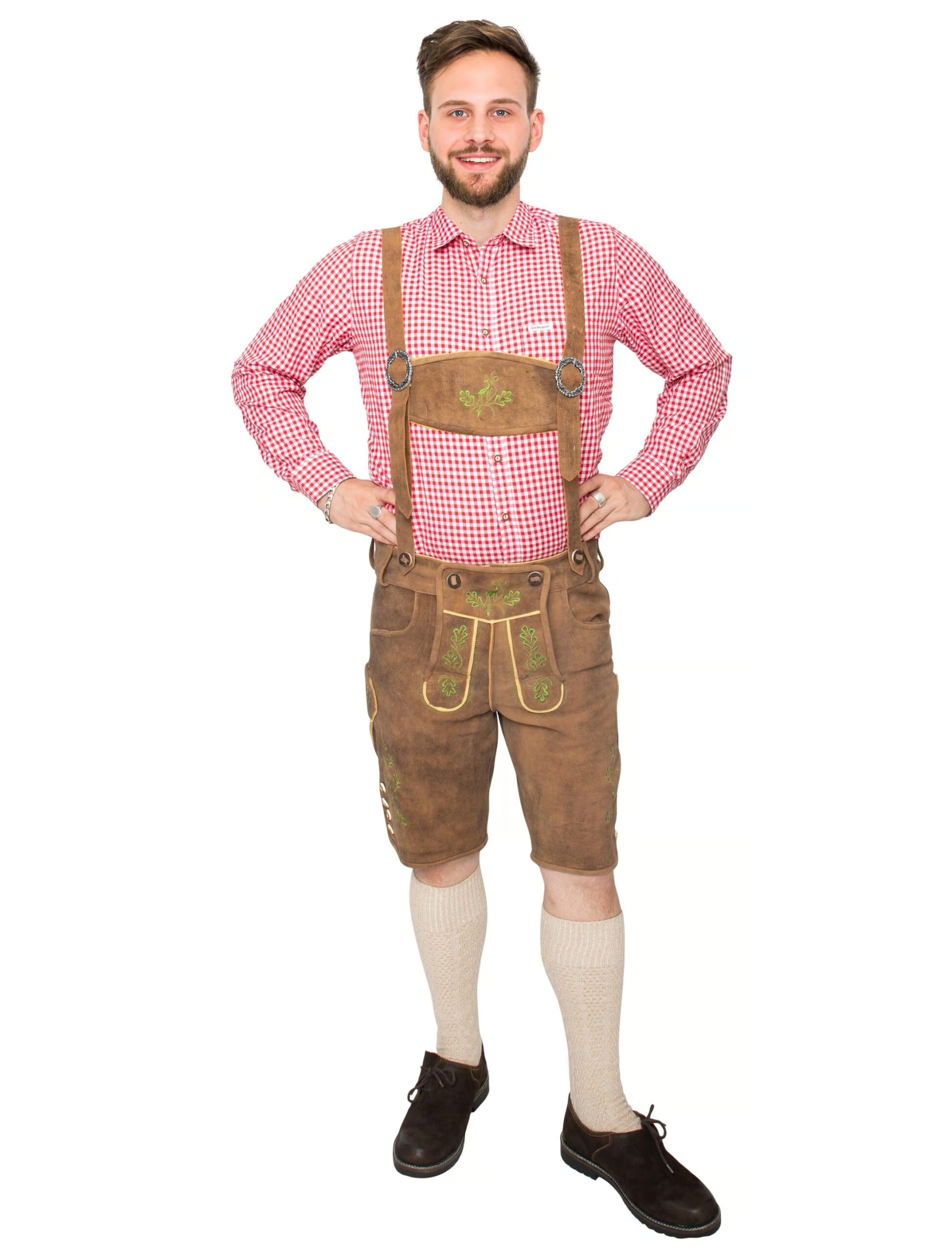 O’zapft is! Mach dich bereit für den ultimativen Trachten-Look! Mit unserer kurzen Lederhose aus echtem Rindsleder wirst du zum Star auf jedem Oktoberfest,Volksfest oder sogar an Karneval! Die edlen Stickereien mit Reh- und Blumenmotiven machen klar: Hier trägt jemand Tradition mit Stil. Die Hosenträger mit hochwertigen Schnallen sorgen nicht nur für den perfekten Sitz, sondern geben dir auch die Freiheit, deine Arme beim Schunkeln, Maßheben oder Brezel-Verteilen ungehindert zu bewegen. Und weil echtes Leder nicht nur zünftig aussieht, sondern auch robust ist, hält diese Hose mehr aus als nur eine wilde Polonaise durchs Festzelt! Also, rein in die Lederhose, Krug hoch – und schon kann die Gaudi beginnen!