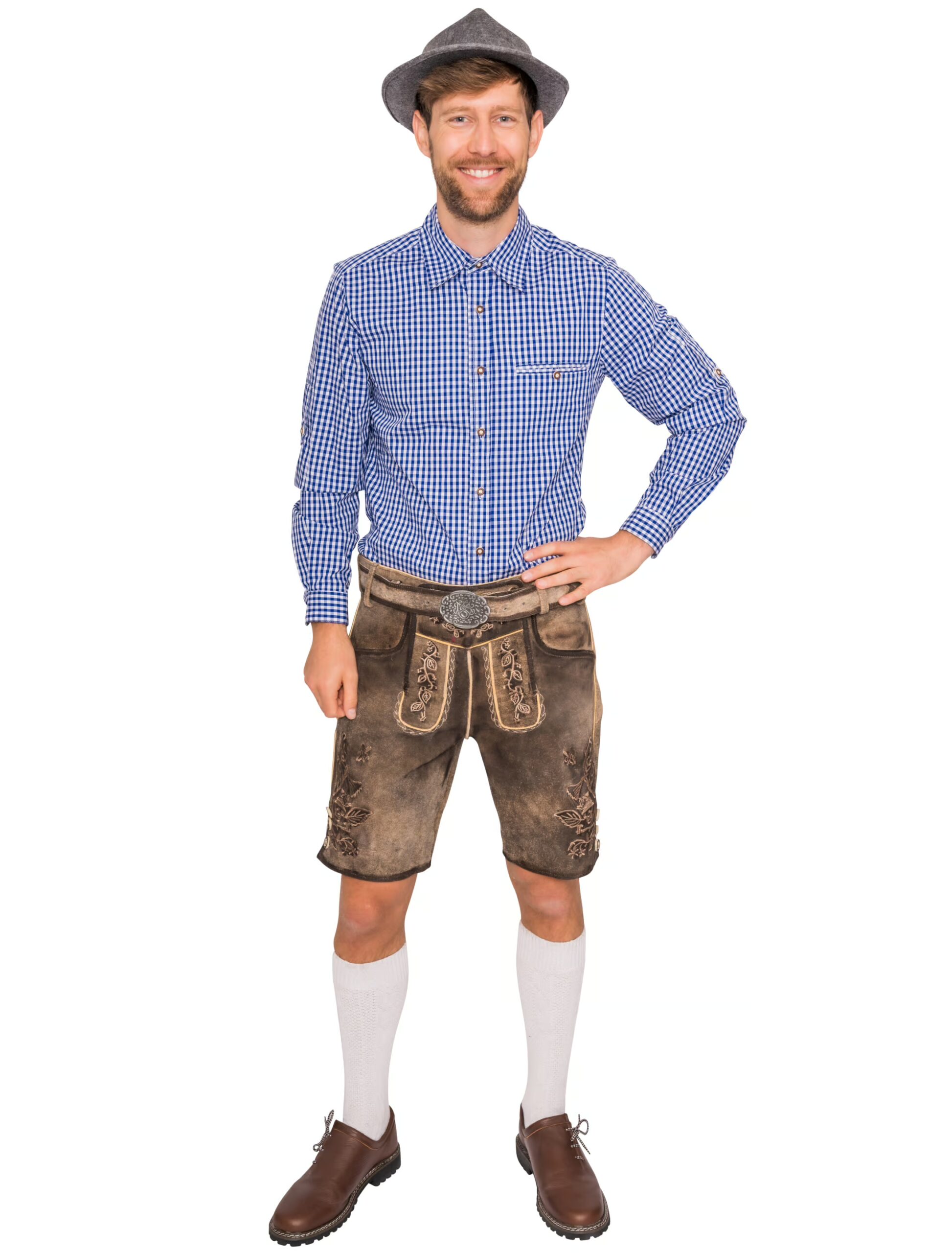 Mit unserer kurzen Lederhose Tino aus hochwertigem, dicken Büffelleder in Grau-Beige mit Gürtel und auffälliger Gürtelschnalle erregst Du sicher Aufsehen bei den Damen. Mit ihren dekorativen Verzierungen am Hosenlatz sowie den echten Hornknöpfen und dem außergewöhnlichen, floralen Muster mit Totenkopf und Axt an den Hosenbeinen ist diese Lederhose etwas besonderes, das Dich nicht nur zum Oktoberfest, sondern auch zu Halloween, zum Fasching, auf Junggesellenabschieden und Mottopartys zum Eyecatcher macht.