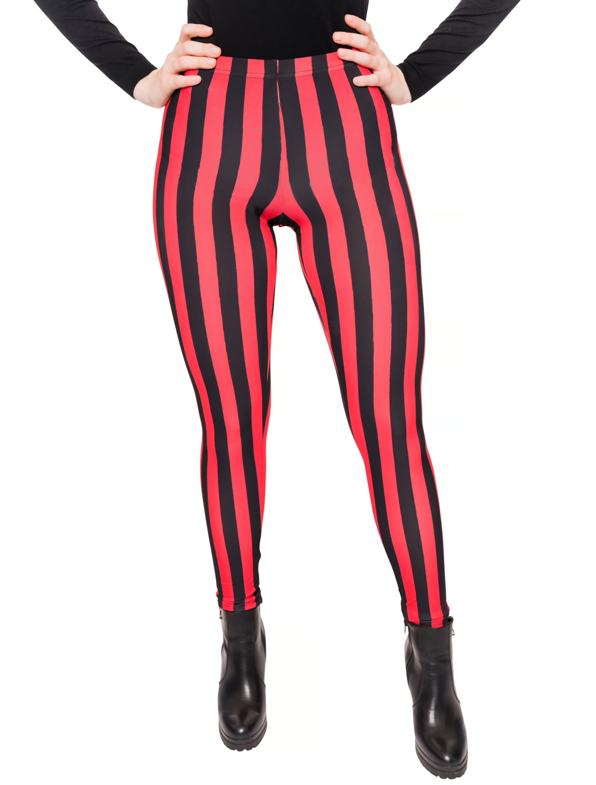 Diese rot-schwarz-gestreiften Leggings sind nicht nur bequem, sondern auch ein sexy Hingucker für zahlreiche Kostüme! Sie passen perfekt zu Clown-, 80er-Jahren-, Disco- und Piraten-Verkleidungen und sind für einen besonders hohen Tragekomfort mit einem Gummizug versehen. Ein toller Hingucker für alle Damen, die ausgefallene Muster lieben und gerne ihre Beine betonen.